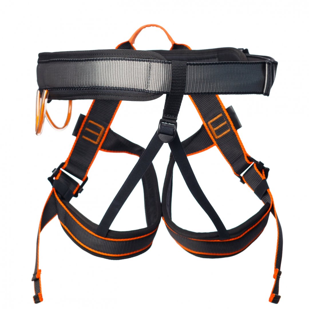Одна быстрозажимная пряжка на поясе. Место крепления страховочной веревки или карабина дополнительно защищено протектором. Ножные петли регулируются с помощью быстрозажимных пряжек. Мягкие накладки на поясе и ножных обхватах.