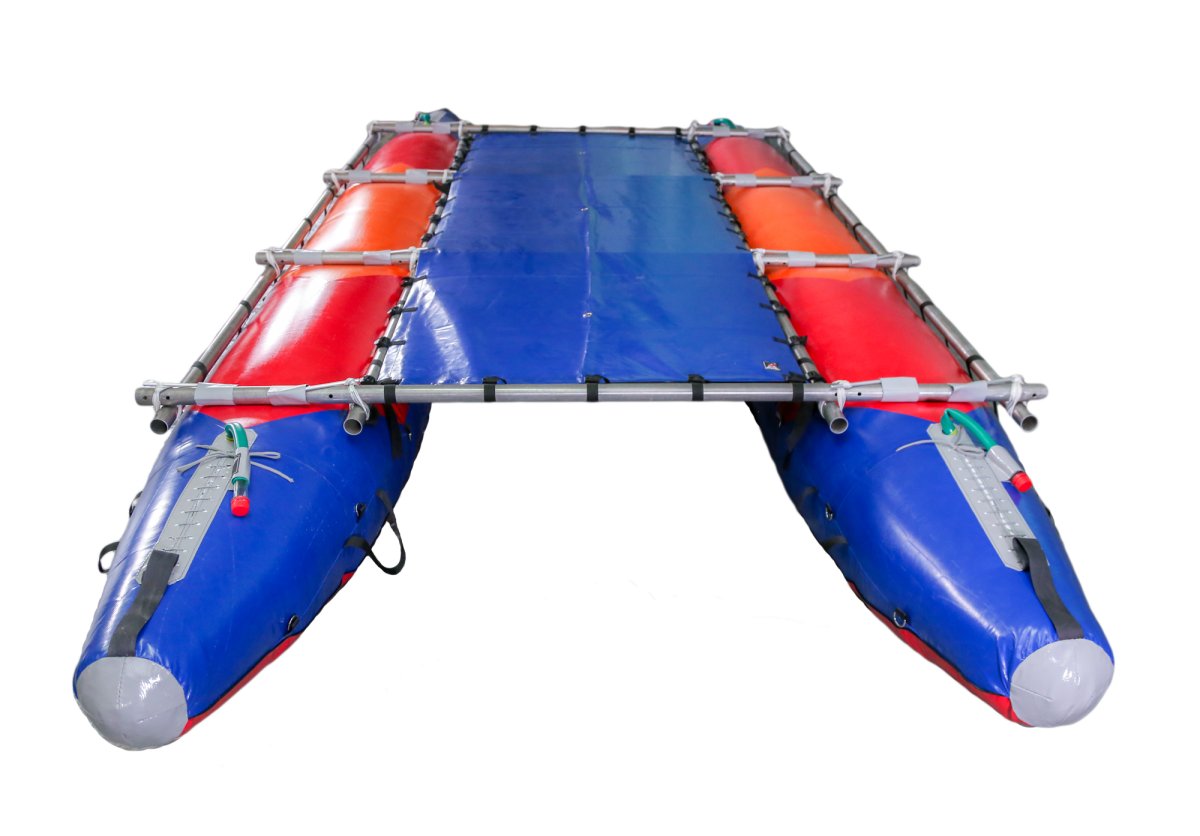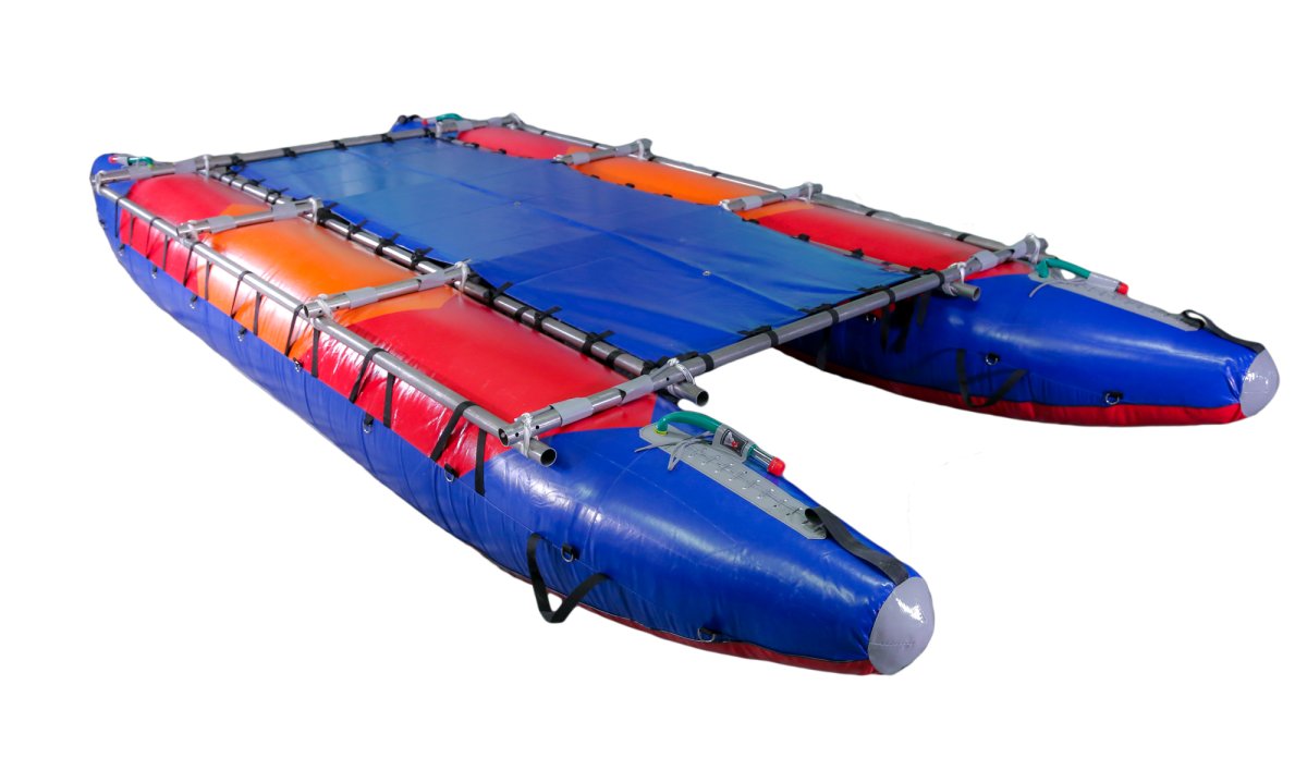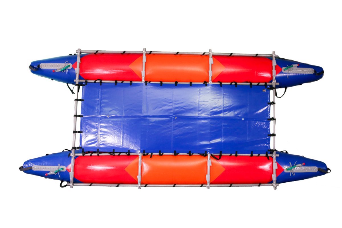 - Палуба растягивается на внутренние продольные трубы рамы катамарана, что позволяет устанавливать пристежные, спортивные или комфортные сидения для катамарана, или свободно привязывать походное снаряжение к раме катамарана