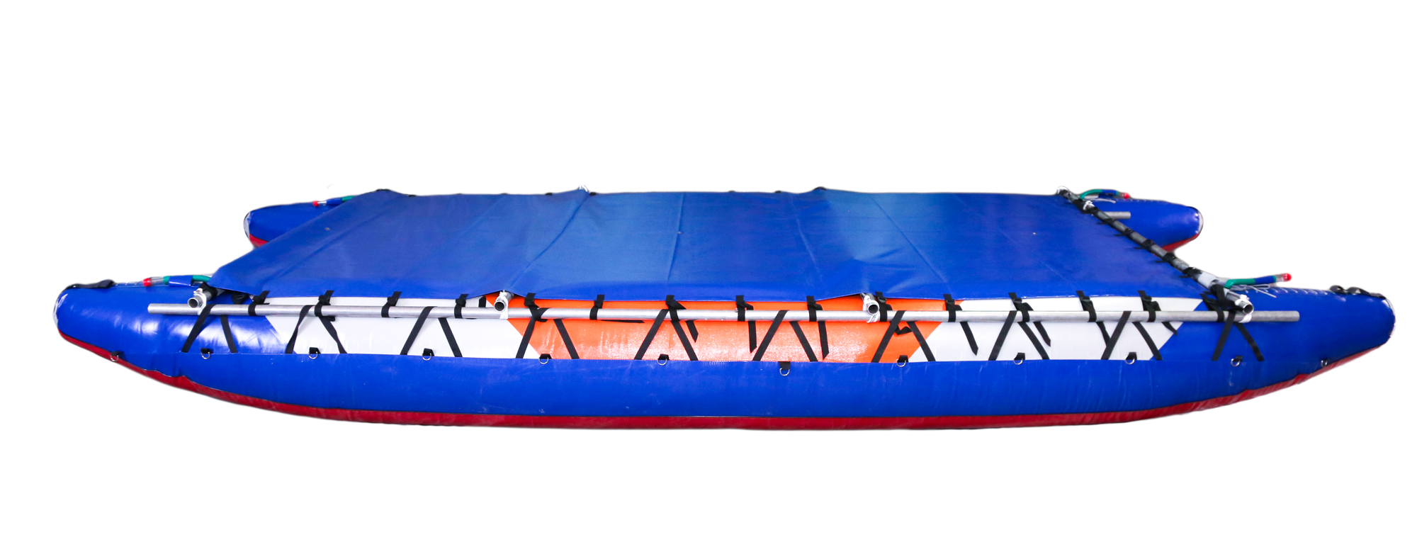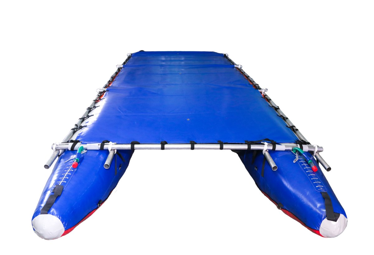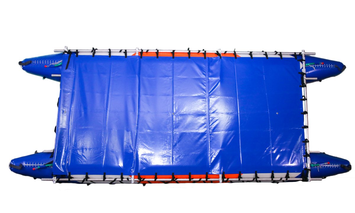 - Широкая палуба растягивается на внешние продольные трубы рамы катамарана, на ней максимально удобно размещать походный груз и снаряжение. При широкой палубе снаряжение на ней хорошо защищено от брызг воды на порогах и перекатах. Удобна для водных походов с детьми