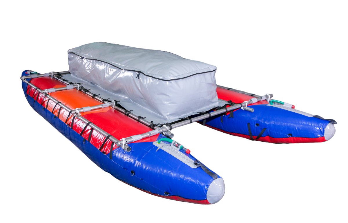 - Палуба растягивается на внутренние продольные трубы рамы, что позволяет устанавливать пристежные, спортивные или комфортные сидения для катамарана или привязывать другое снаряжение (рюкзак, гермомешок) для сидения на катамаране