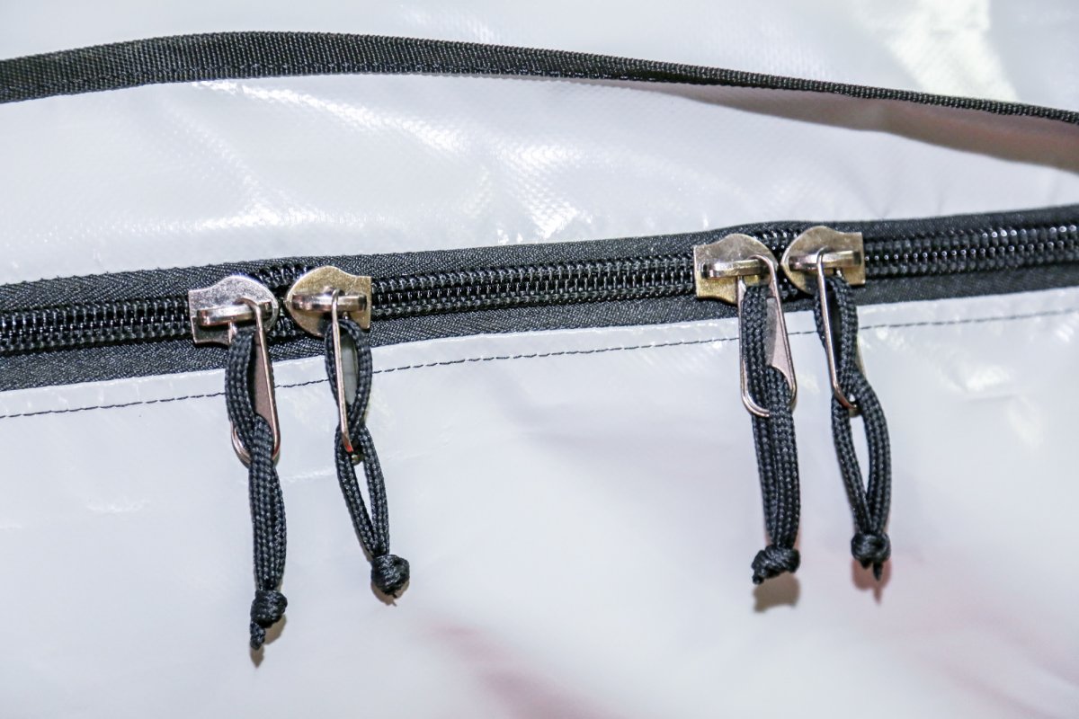 - Крышка сумки застегивается на прочную молнию. На молнии находится четыре пары бегунков, они распределяются по молнии и позволяют всем членам экипажа четырех местного катамарана иметь доступ к содержимому сумки во время движения