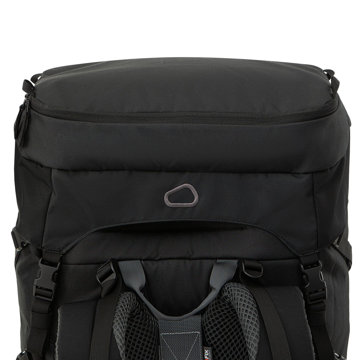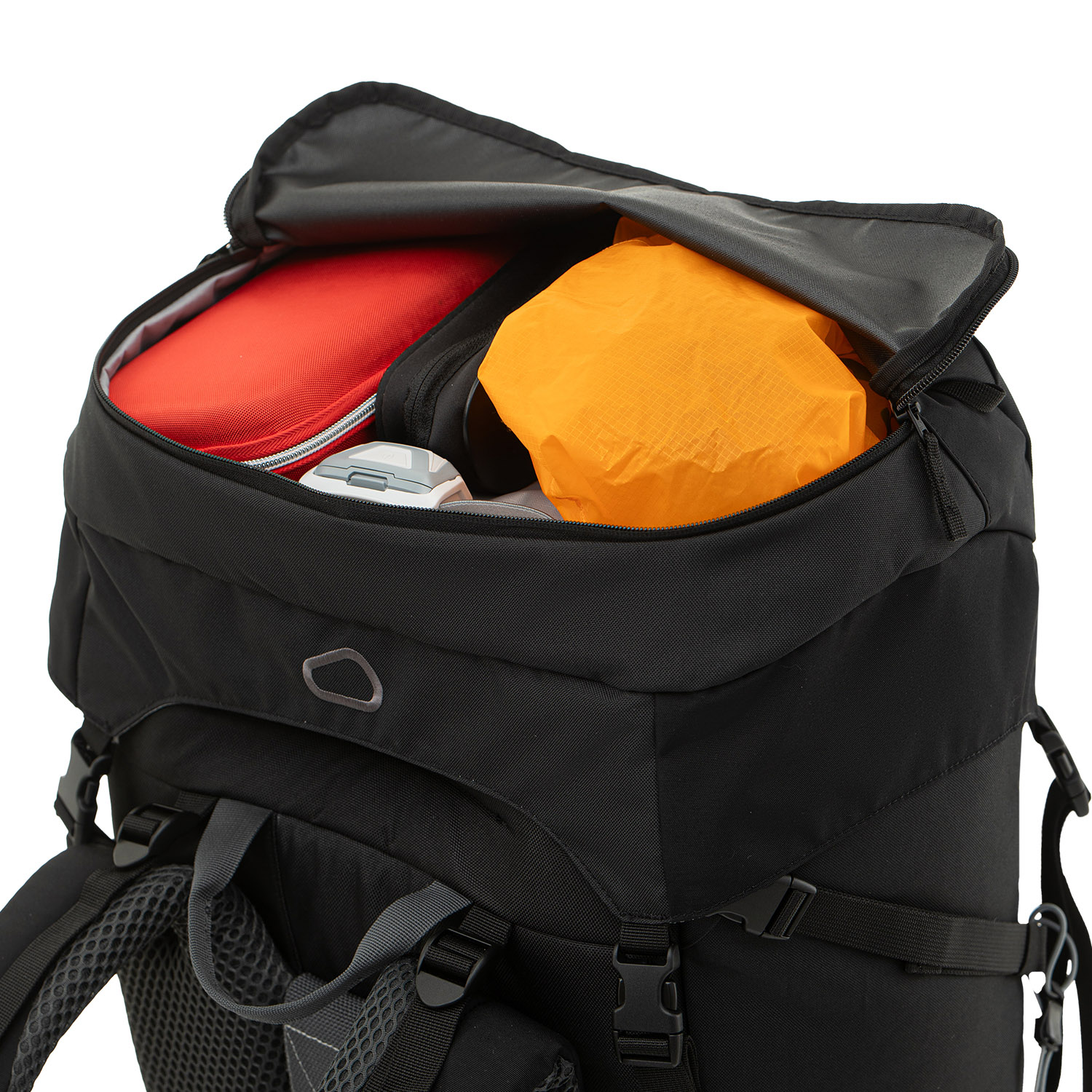 Объём основного отделения можно увеличить на 15 литров благодаря «плавающему» клапану и тубусу с утяжкой. Сам клапан съёмный — его можно использовать как отдельную небольшую сумку для радиальных выходов. Основное отделение имеет доступ сверху и снизу, нижняя часть отделена перегородкой на молнии — удобно для спального мешка и тёплой одежды.
