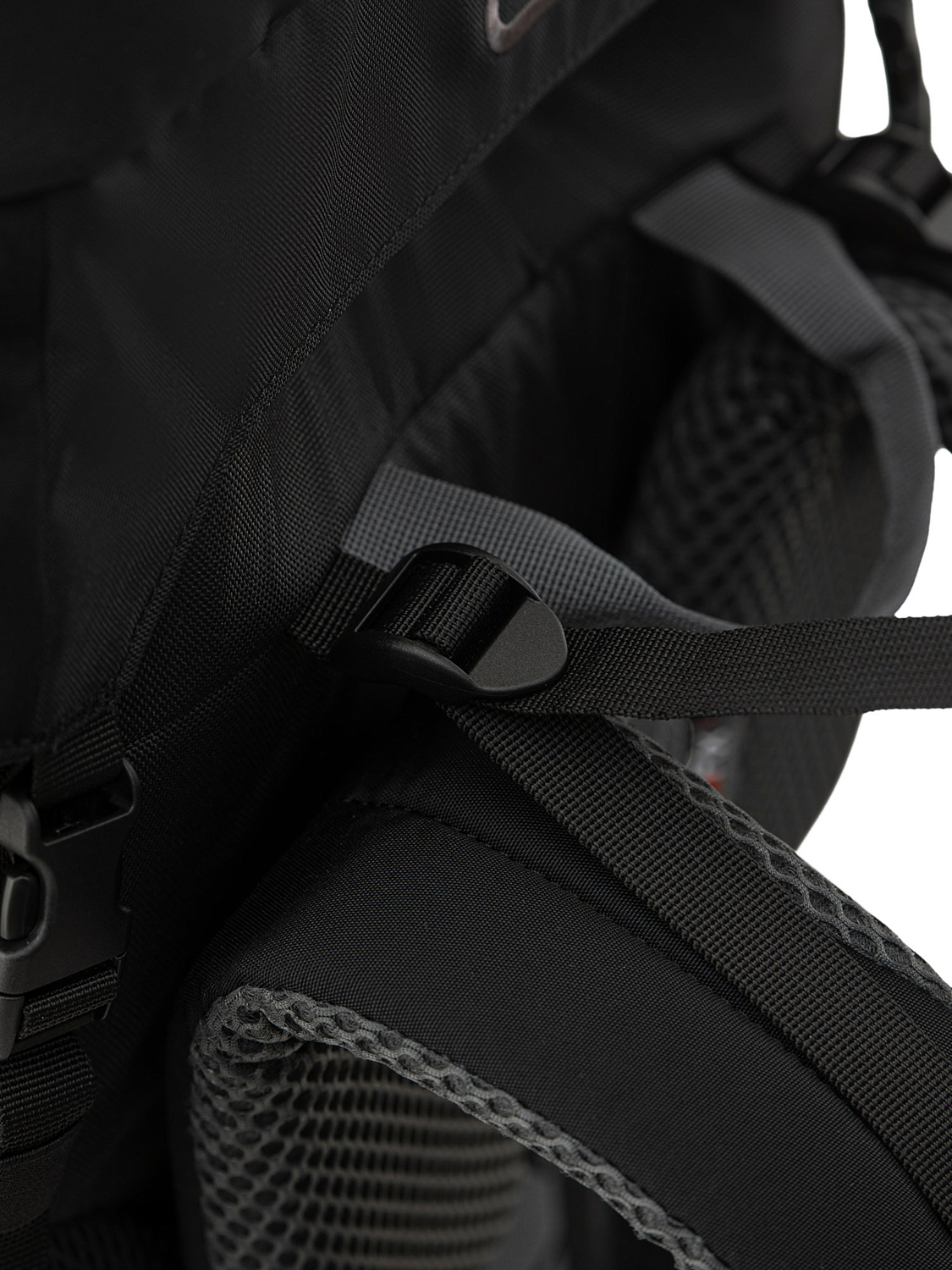 На клапане предусмотрен вместительный карман для аптечки, документов и других нужных вещей. Также есть петли для крепления репшнура или шнура — удобно для сушки мокрой одежды. Внешние карманы: два боковых глубоких эластичных для фляг и термоса, фронтальный «кенгуру»-карман для флиски или мембранной куртки. На фасаде — крепления для треккинговых палок и ледоруба, на дне — стропы с фастексами для коврика или палатки. Внутри — карман под питьевую систему с выходом трубки на любую лямку.