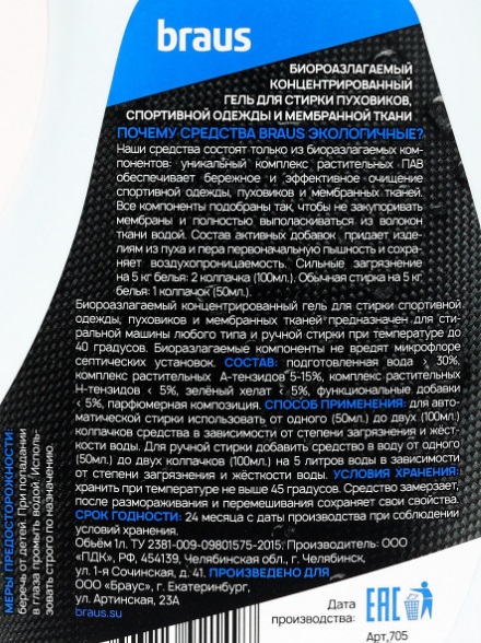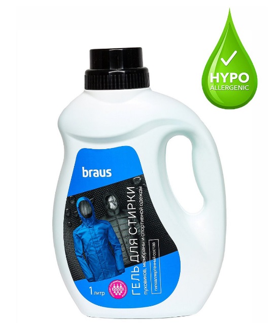 Комплекс растительных биоразлагаемых ПАВ обеспечивает бережное и эффективное очищение пуховиков, спортивной одежды и мембранных тканей. Все компоненты подобраны так, чтобы не закупоривать мембраны и полностью выполаскиваться из волокон ткани.