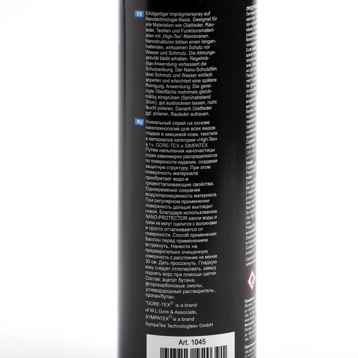 Спрей на основе нанотехнологий, разработанный для применения на всех типах гладкой и замшевой кожи, текстиля и материалов категории "High-Tex", включая GORE-TEX и SIMPATEX. Этот спрей основан на наночастицах, которые равномерно распределяются по поверхности изделия, создавая защитную структуру. В результате поверхность приобретает свойства, отталкивающие воду и грязь, при этом сохраняя воздухопроницаемость материала. При регулярном использовании спрея поверхность дольше сохраняет свой новый вид. Благодаря применению NANO-PROTECTOR, капли воды и грязи не могут сцепиться с волокнами и просто отскакивают от поверхности.