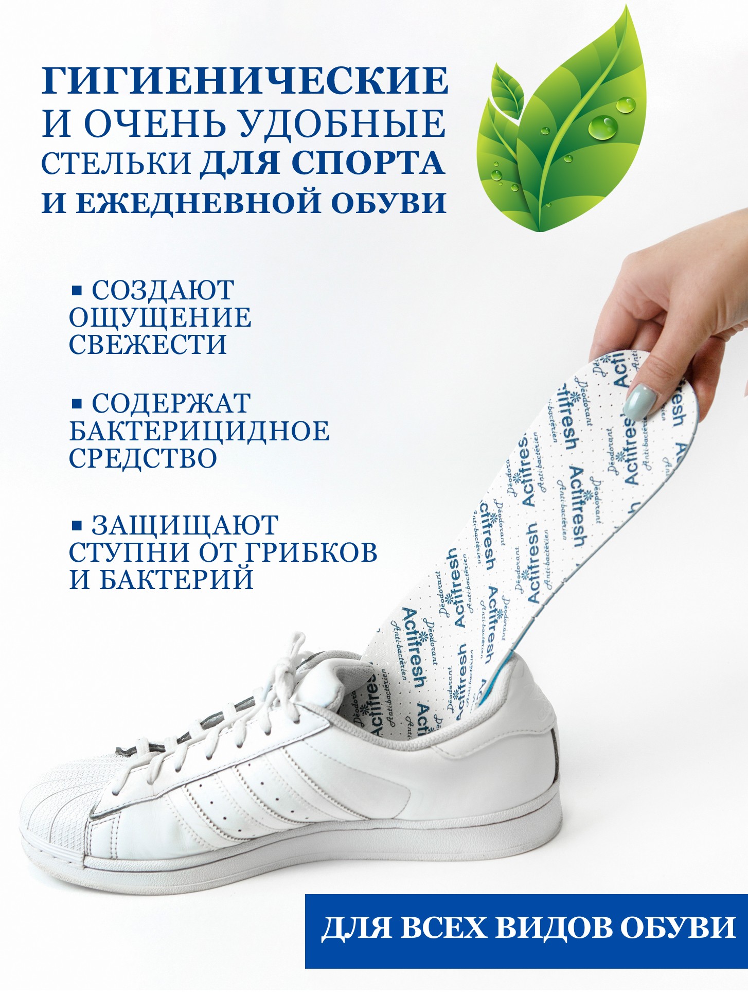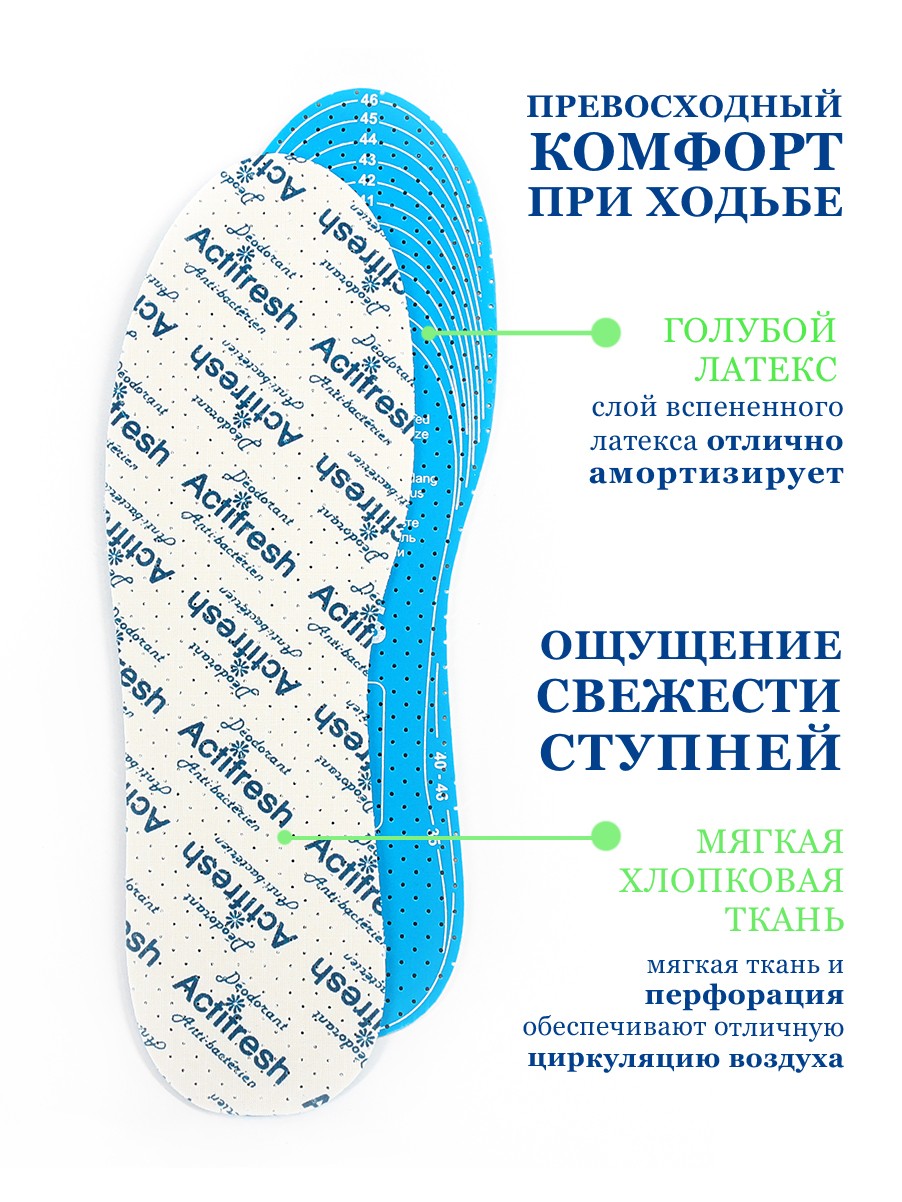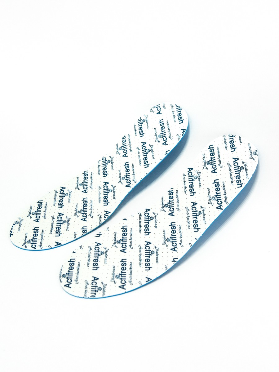 Стельки изготовлены из двух слоев латексной пены. Первый слой содержит швейцарское средство SANITIZED, которое эффективно защищает ноги от грибков и бактерий. Дезодорирующее вещество, входящее в состав второго латексного слоя, действует при ходьбе под силой тяжести, устраняет запах и создает ощущение свежести. Перфорированные латексный слой и покрытие из хлопчатобумажной ткани обеспечивают вентиляцию обуви и устраняют влажность. Благодаря эластичным свойствам латекса, стельки являются прекрасным амортизатором и гарантируют комфорт.