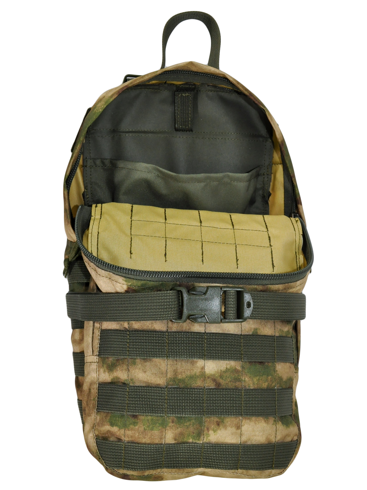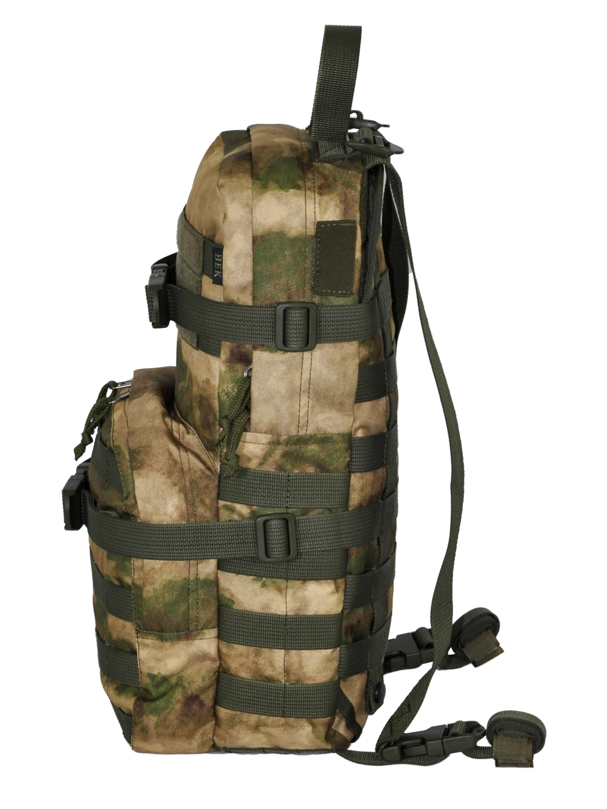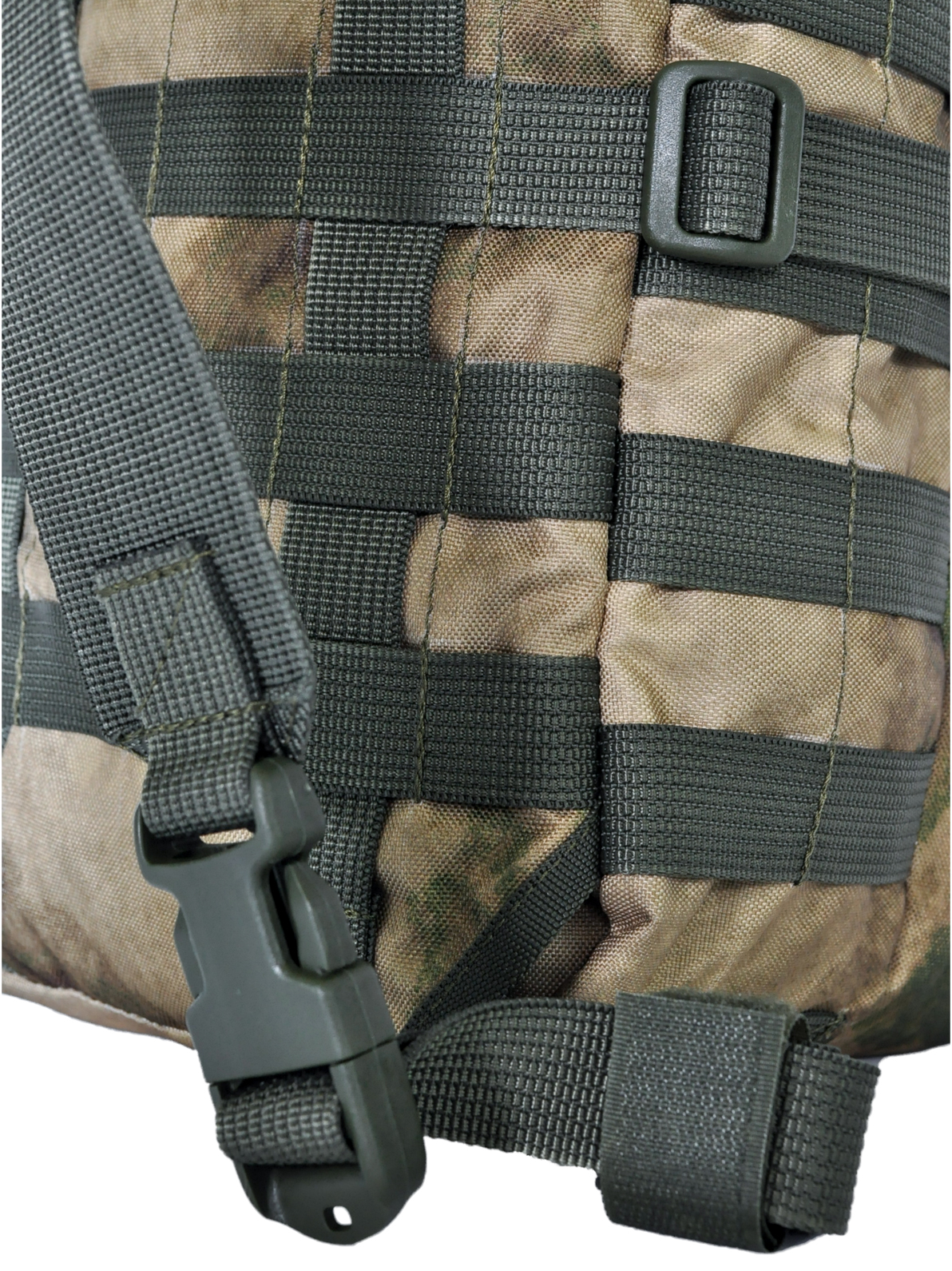 - На боках и задней стенке система крепления Molle. Универсальная система крепления позволяет прикреплять дополнительные подсумки и любое другое снаряжение на рюкзак, а также рюкзак прикрепить к ременно-поясной системе