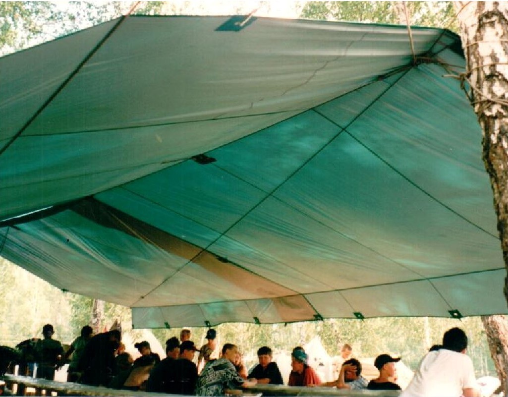 - Тент имеет опорные люверсы с внутренним Ø 2см по периметру и в центре, что позволяет устанавливать его при помощи стоек на открытой местности. Стойками может служить любой жердевой материал