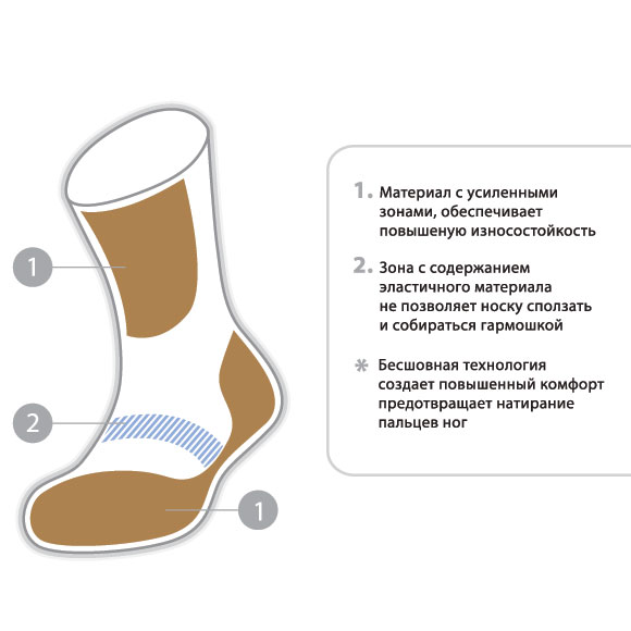 - Зона с содержанием эластичного материала не позволяет носку сползать и собираться гармошкой