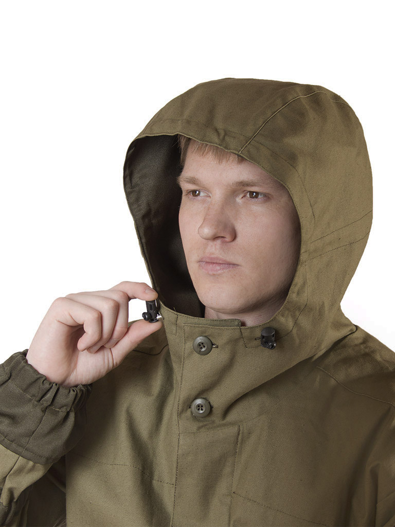 Свободный крой. Центральная застежка куртки на потайные пуговицы. Регулировка по низу, линии талии, лицевому вырезу капюшона при помощи эластичного шнура с фиксатором.