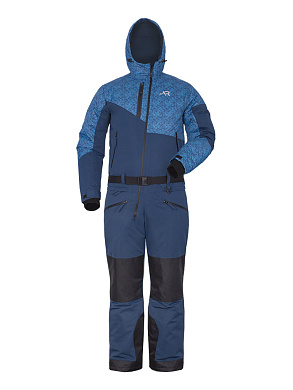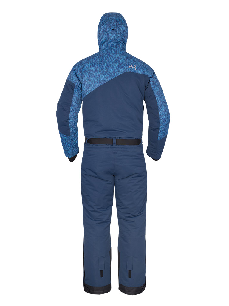 На уровне бедер функциональный клапан на «молнии» с внутренней ветрозащитной планкой. Длина комбинезона по низу регулируется патами с «велкро». По низу брюк застежка и снегозащитная муфта, которые не допускают попадания снега вовнутрь и обеспечивают удобство надевания комбинезона поверх горнолыжной обуви. Усилители по нижней части комбинезона для защиты от истирания материала верха. Пояс из стропы, для регулировки объема по талии.