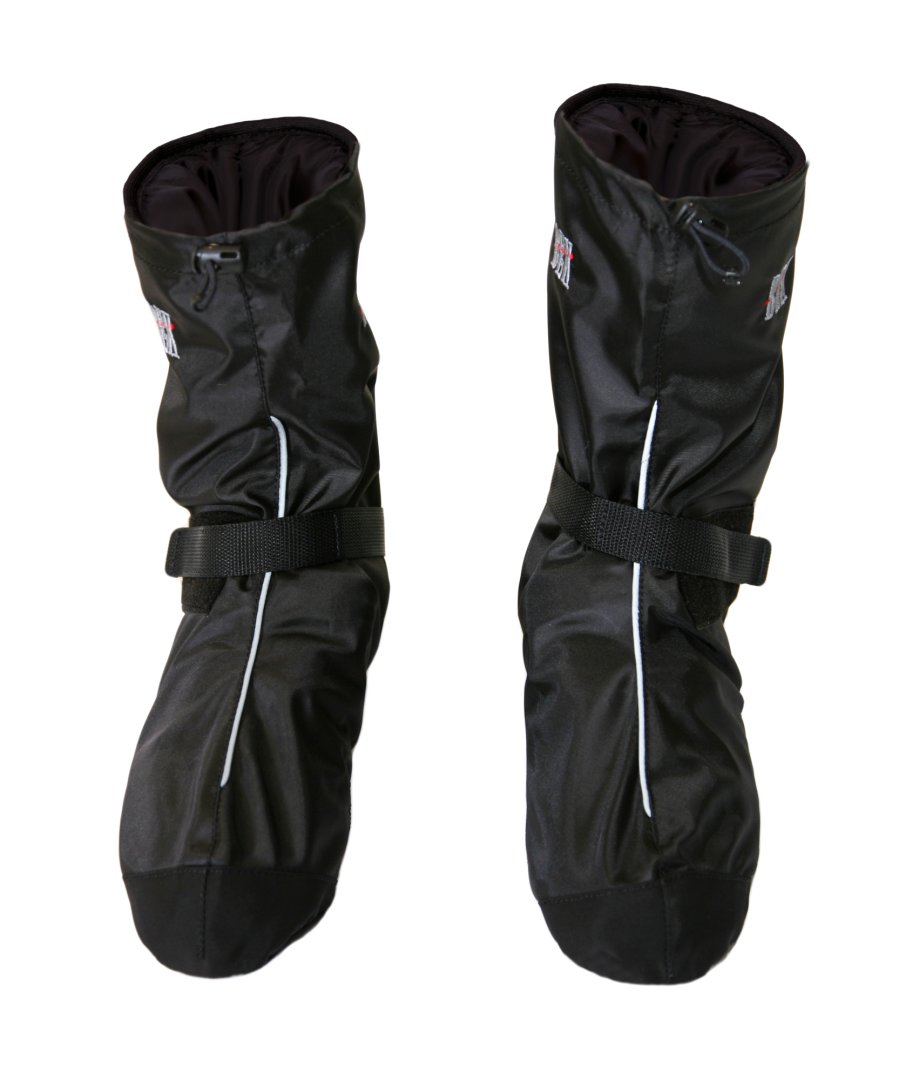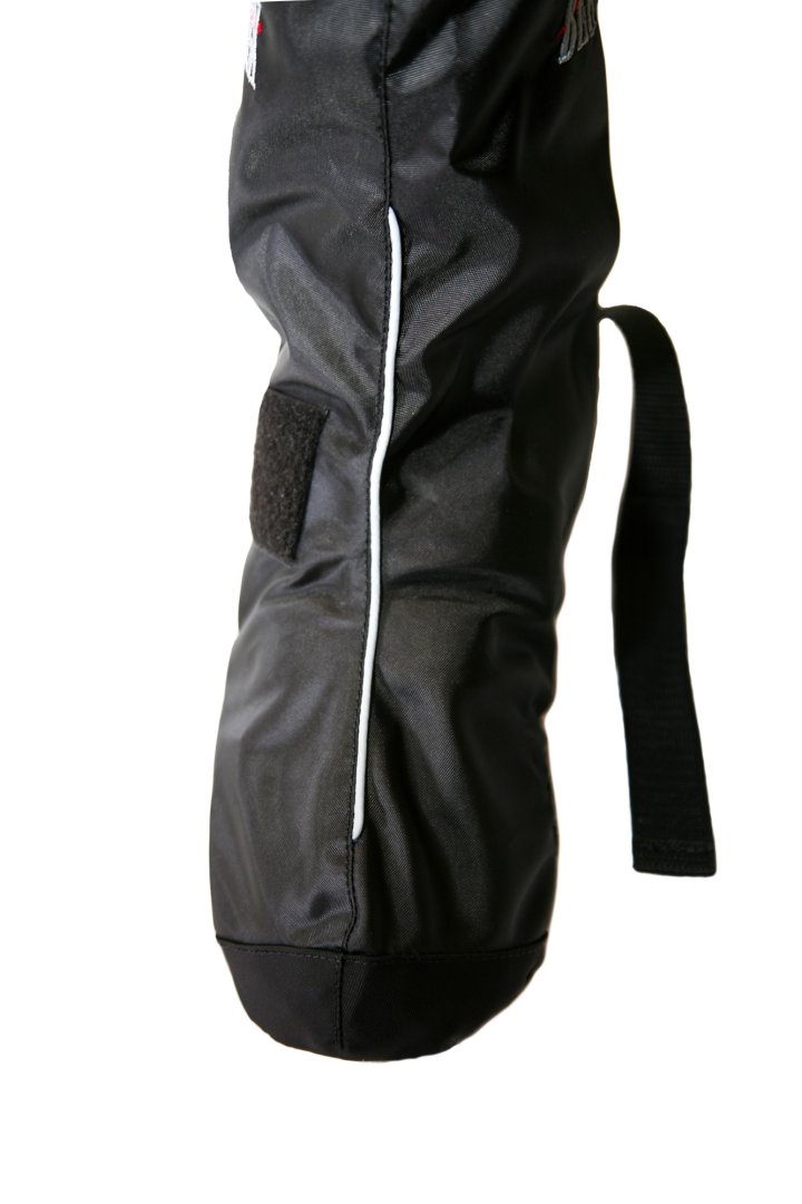 - Верхняя часть велобахил снабжена регулируемой утяжкой для более плотного прилегания бахил к ноге и предотвращения попадания воды