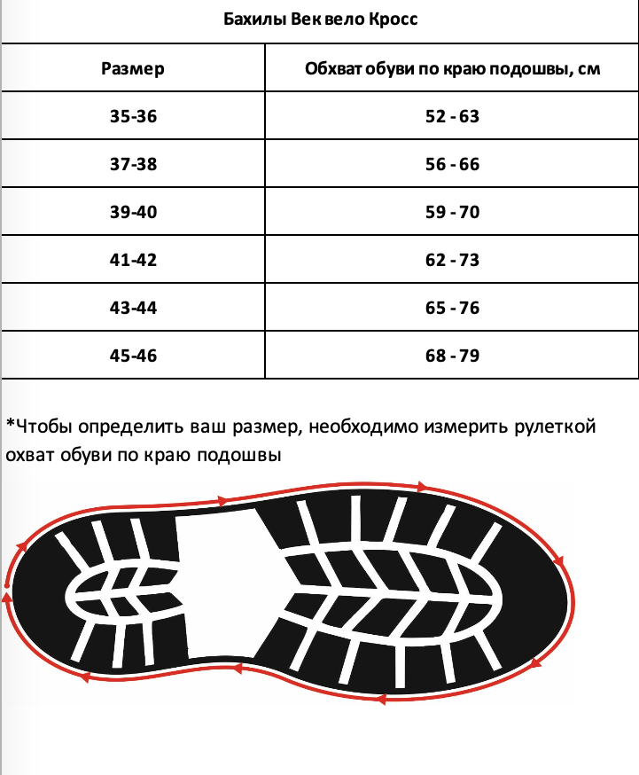 - Велобахилы надеваются НА ботинки, обхват обуви при одном и том же размере может сильно отличаться, поэтому размеры велобахил не привязаны сильно к размеру обуви. Чтобы подобрать Велобахилы воспользуйтесь таблицей. В таблице указано соответствие размера велобахил обхвату обуви по краю подошвы, чтобы подобрать нужный вам размер рекомендуем измерить рулеткой эту величину