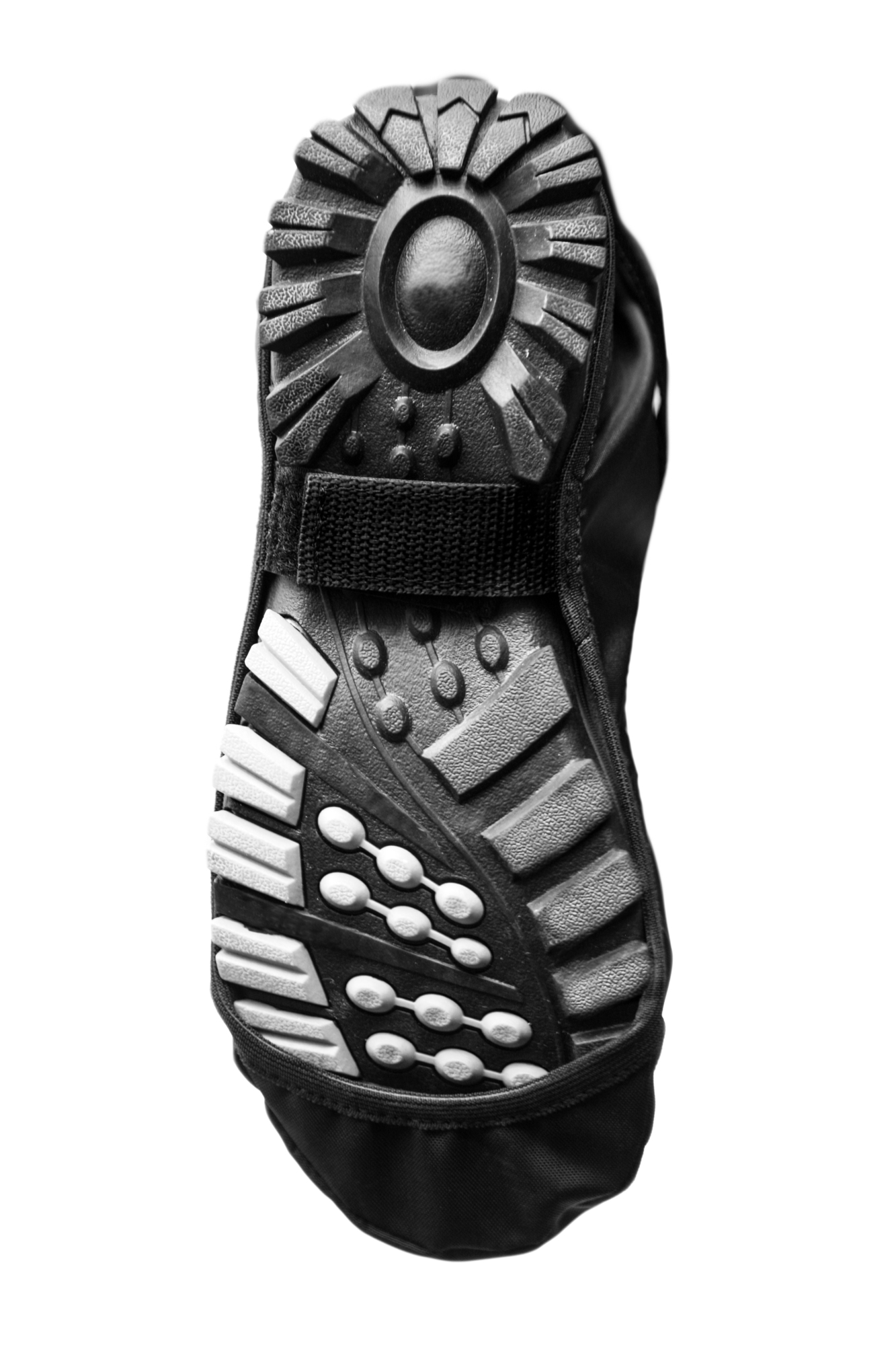 - Стропа с застежкой Velcro позволяет зафиксировать велобахил на взъёме и дополнительно закрепить нижний край велобахилы на пятке