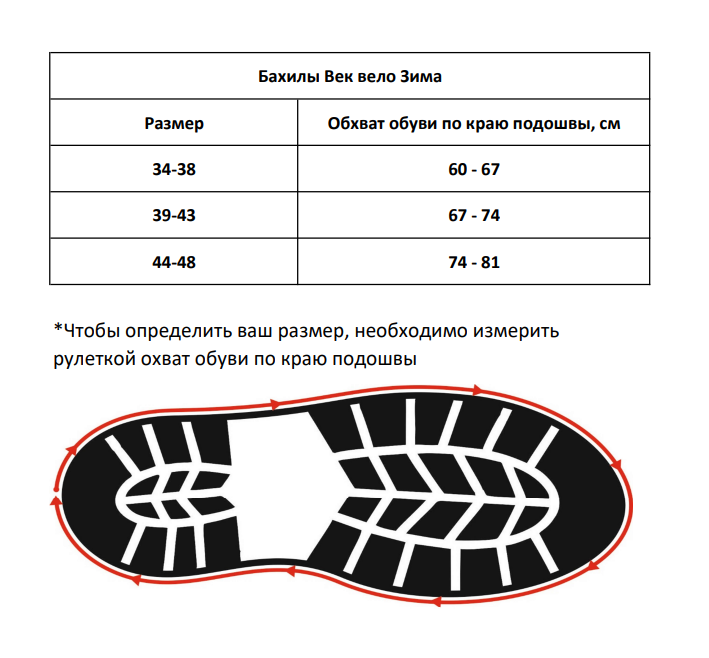- Велобахилы надеваются НА ботинки, обхват обуви при одном и том же размере может сильно отличаться, поэтому размеры велобахил не привязаны сильно к размеру обуви. Чтобы подобрать Велобахилы воспользуйтесь таблицей. В таблице указано соответствие размера велобахил обхвату обуви по краю подошвы, чтобы подобрать нужный вам размер рекомендуем измерить рулеткой эту величину