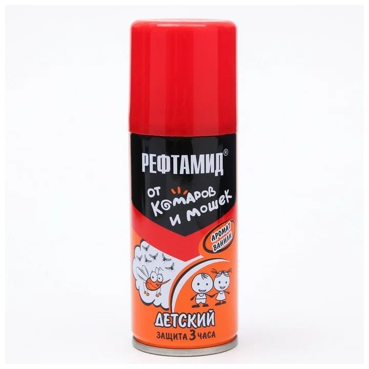 Средство репеллент от торговой марки «Рефтамид» применяется для защиты детей от укусов кровососущих насекомых (комаров, мокрецов, москитов). Состав препарата разработан с учётом особенностей чувствительной кожи ребёнка. Детям с трёхлетнего возраста средство наносится на одежду, с пятилетнего возраста — на открытые части тела.