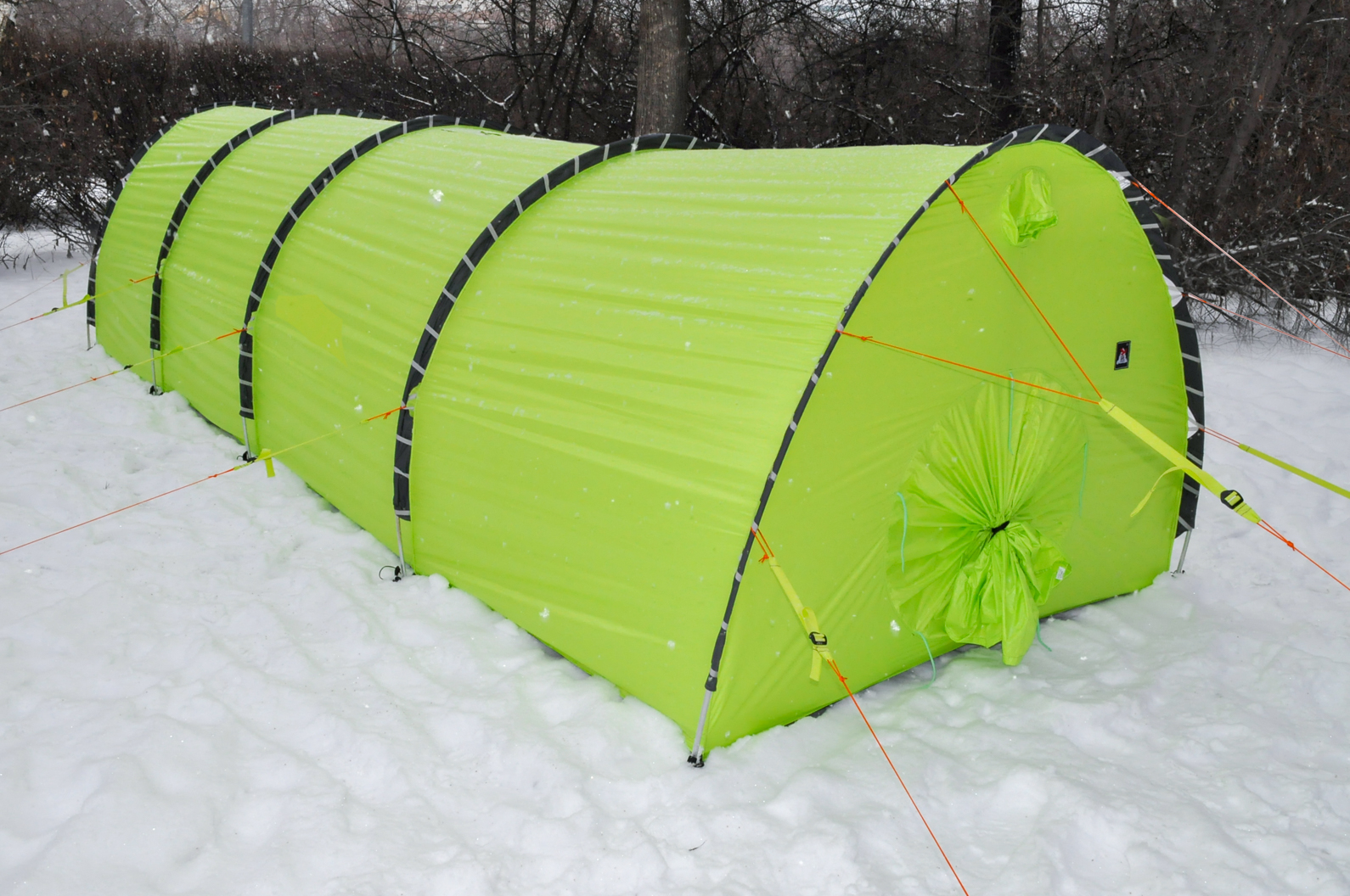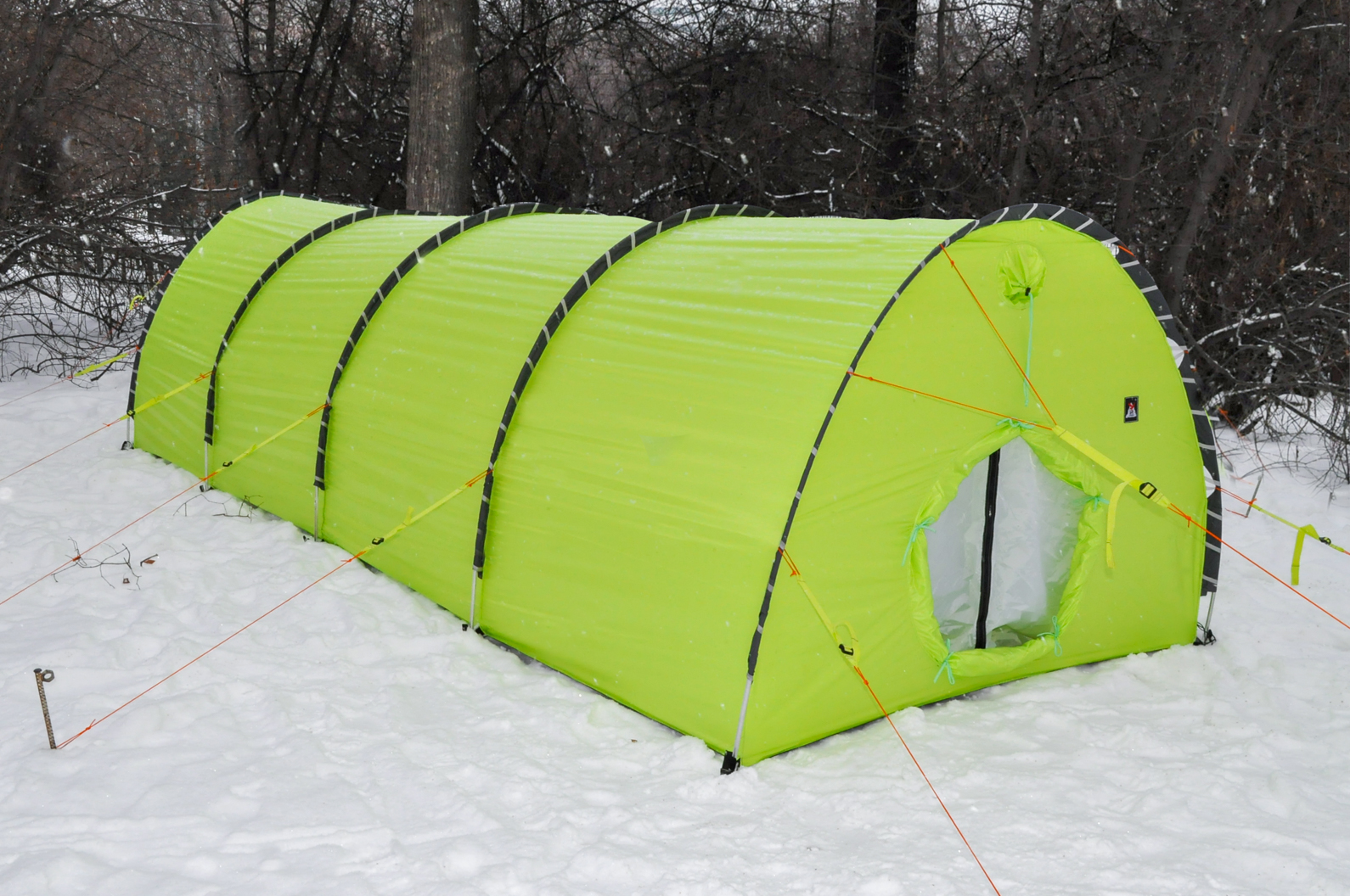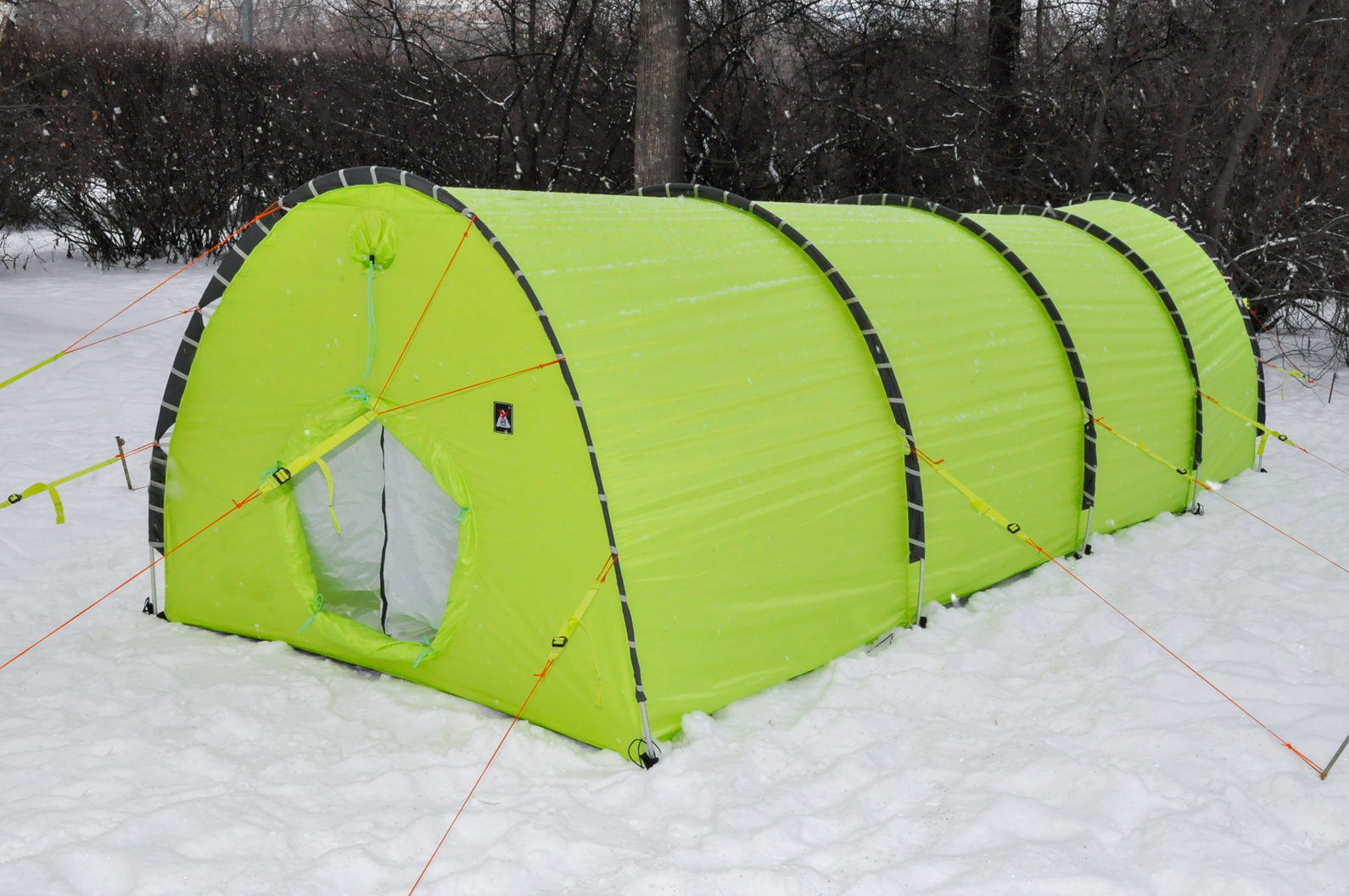 - В качестве дополнительного оборудования к палатке вы можете заказать ветроотбойный клин, который с помощью пряжек прикрепляется к торцу палатки. Его предназначение – уменьшить нагрузку на торец палатки при сильных ветрах, особенно в местах где нет возможности установить перед торцом палатки снежную стенку.