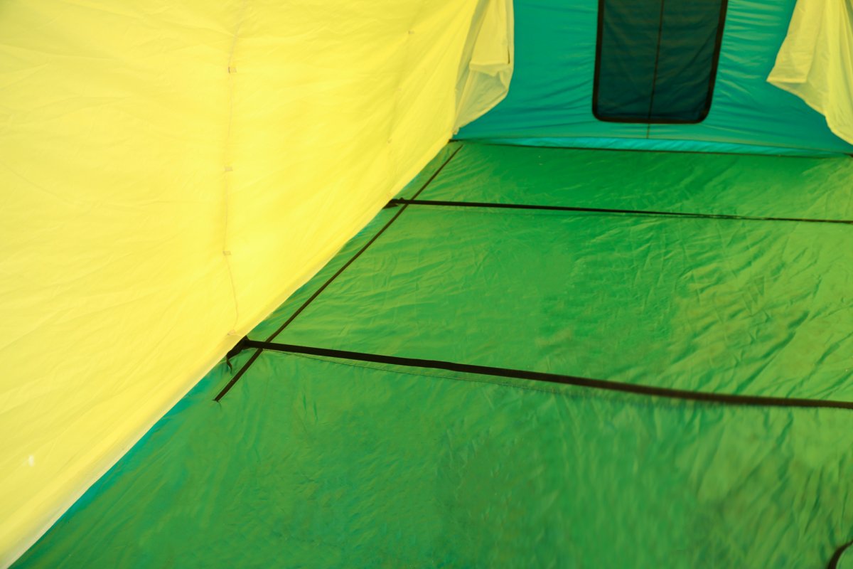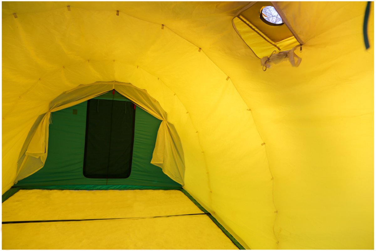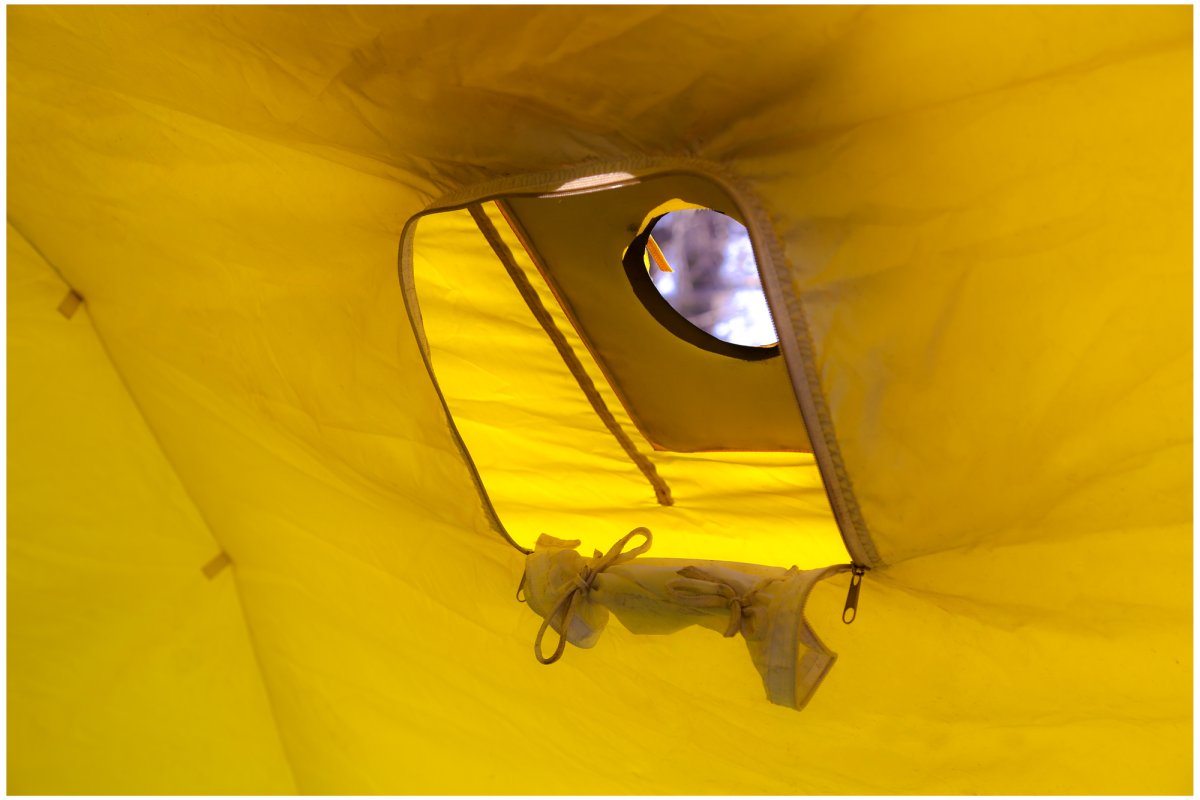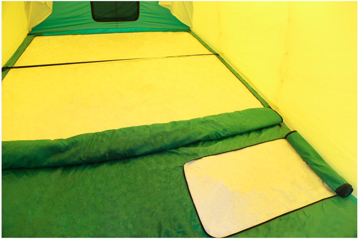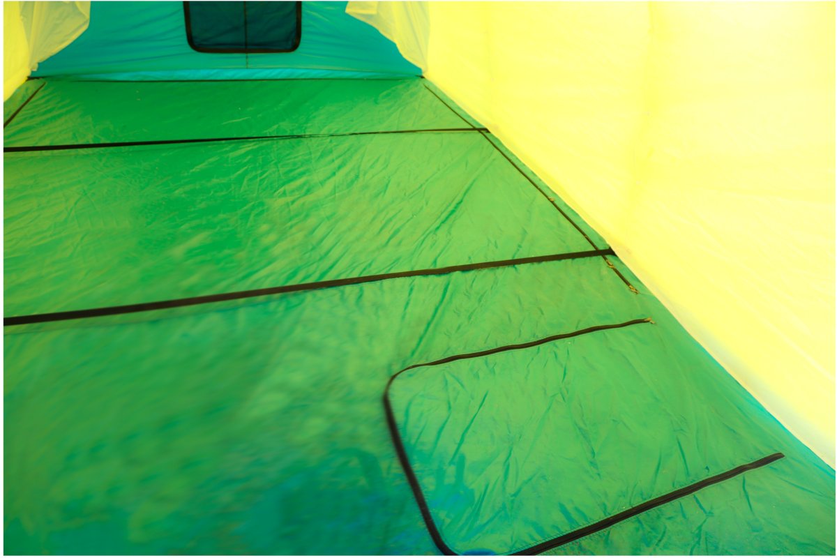 - В дно палатки вшита молния, что позволяет отстегнуть дно и использовать палатку для ремонта снегоходной техники зимой в походных условиях находясь при этом в тепле