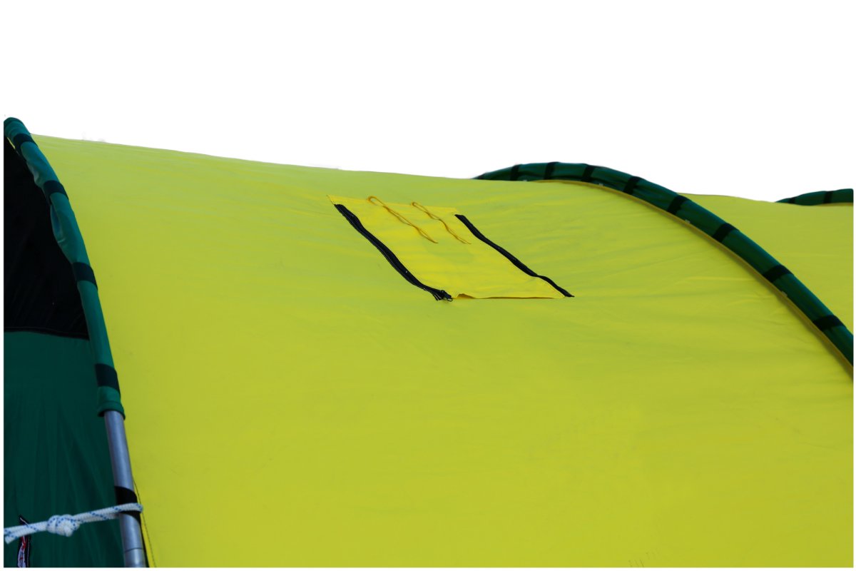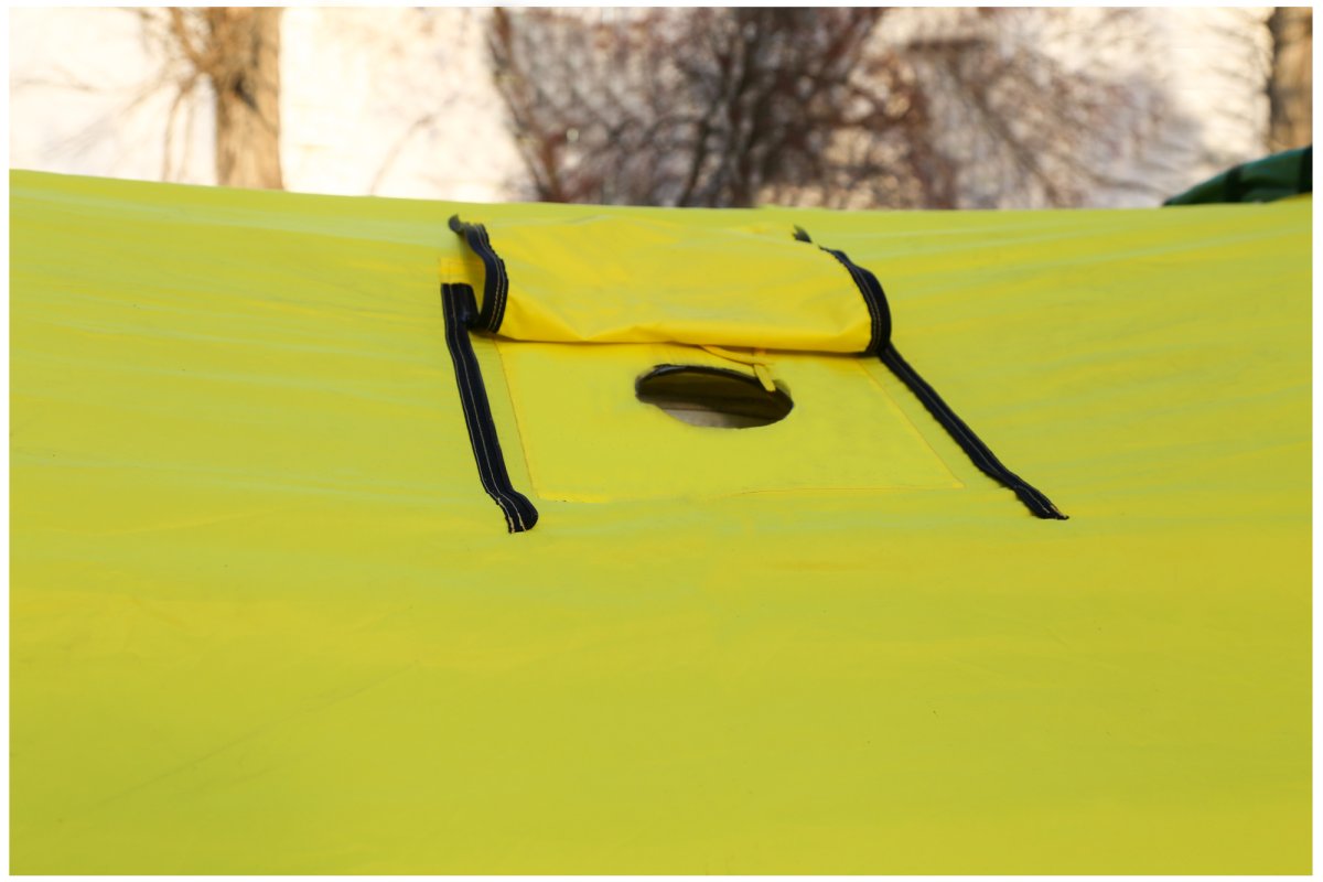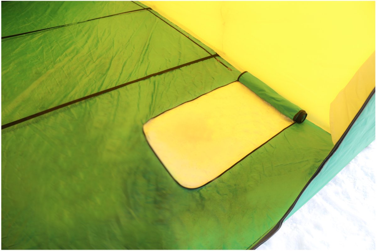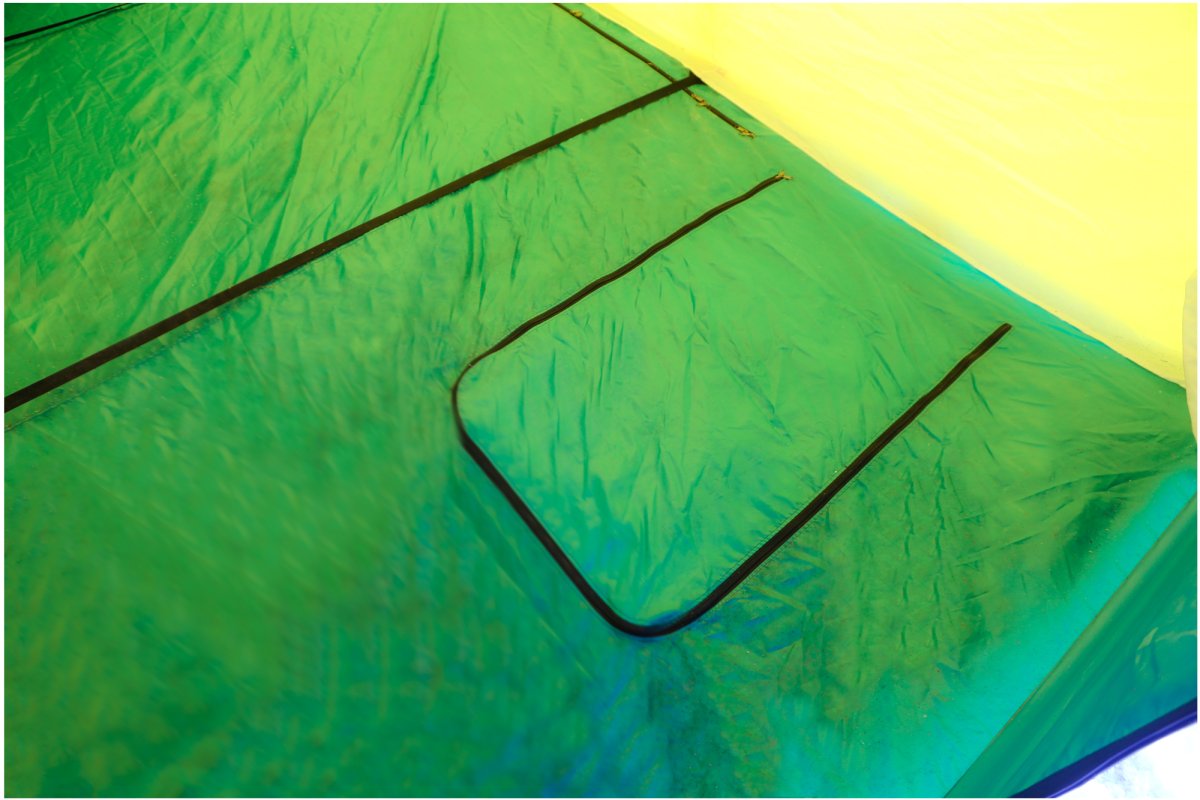 - В дне палатки расположен клапан на молнии – люк, позволяющий установить походную печку на землю или снег при необходимости