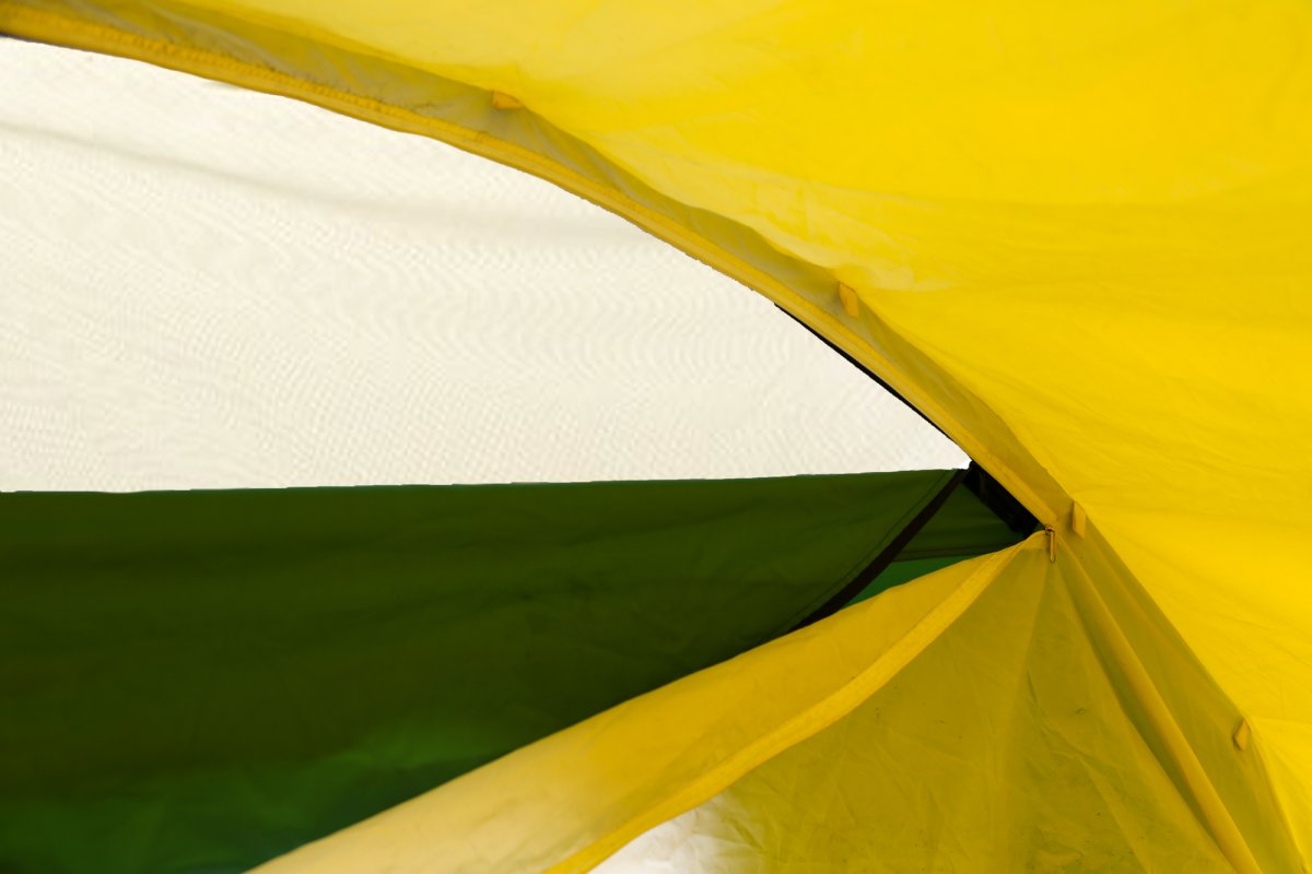 - Слои соединены между собой стропами, которые обеспечивают воздушный зазор между ними. Конструкция соединения слоев стропами армирует и увеличивает прочность палатки. Это позволяет эксплуатировать палатку в условиях сильных ветров
