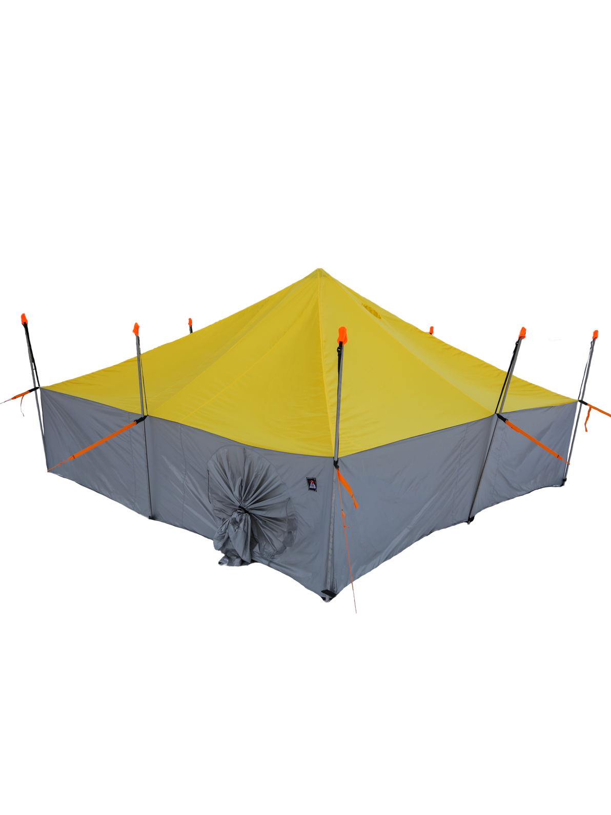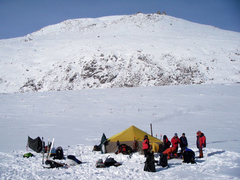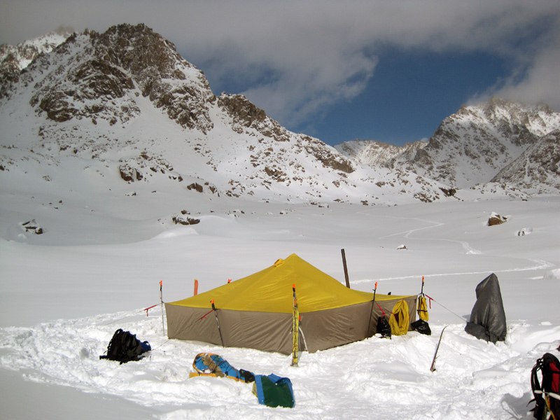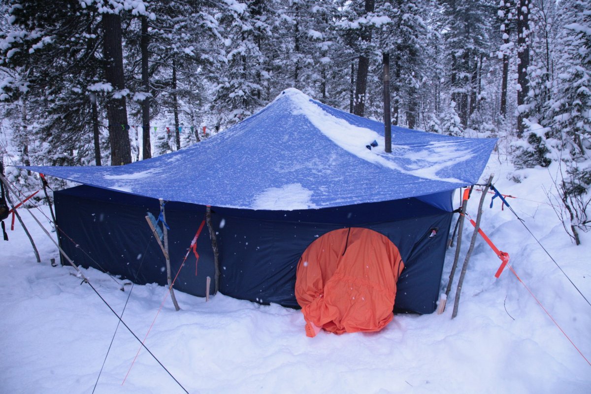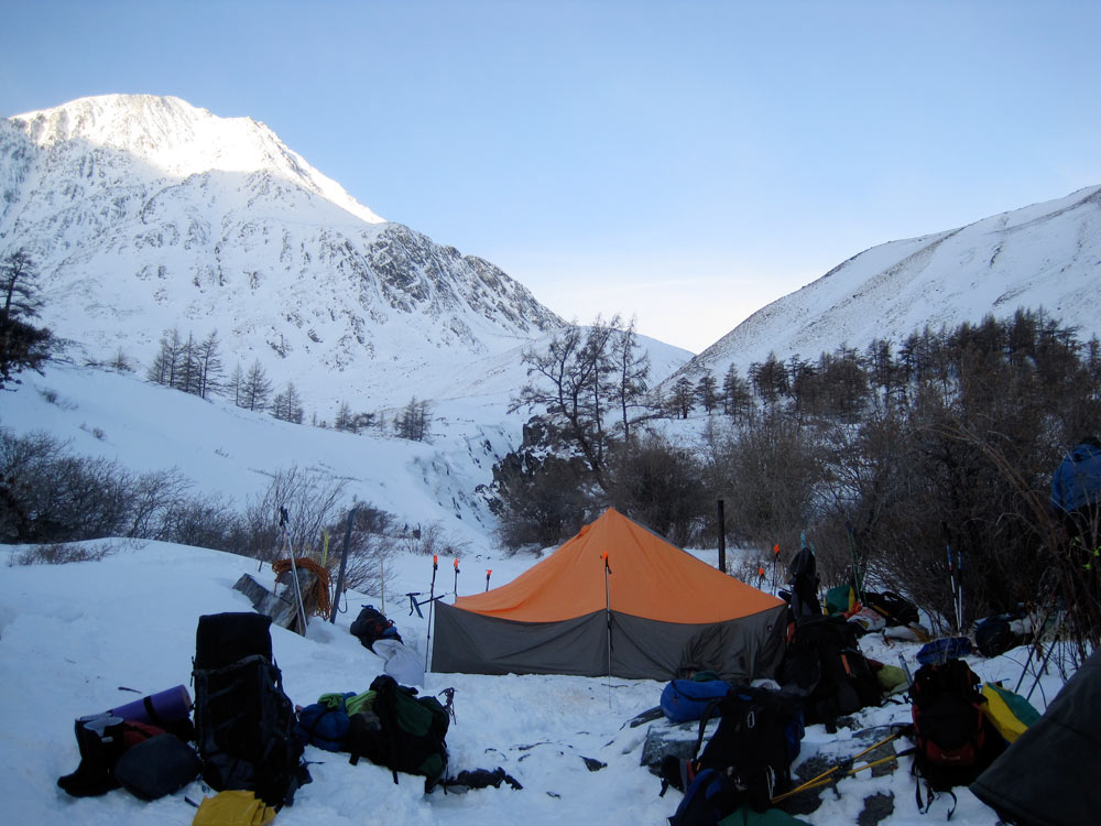 Двухслойная туристическая палатка-шатер Тикси-12 для лыжных зимних походов. Конструкция палатки позволяет установить в ней туристическую печь, а наличие двух слоев обеспечивает оптимальную температуру при минимальном количестве дров.