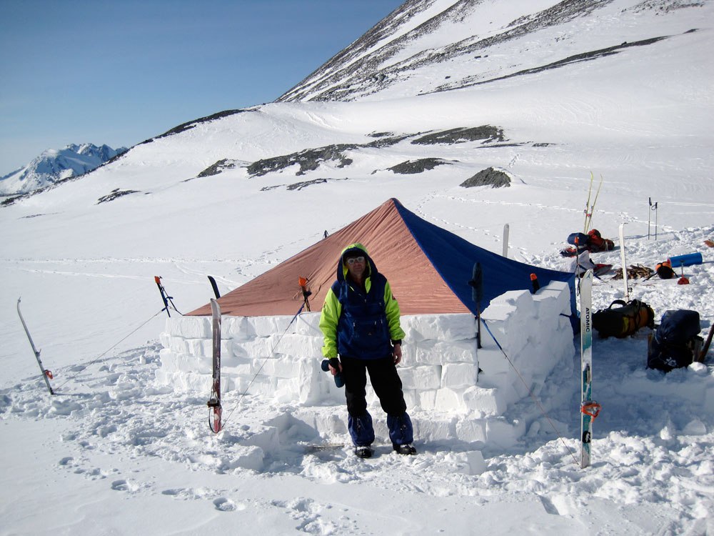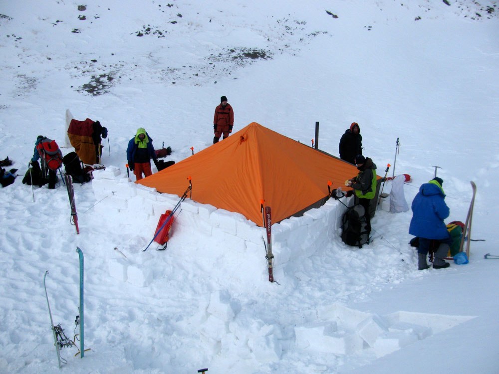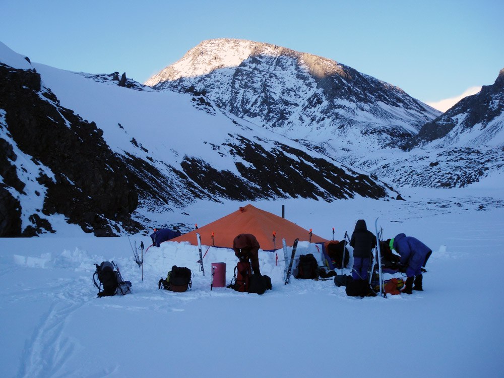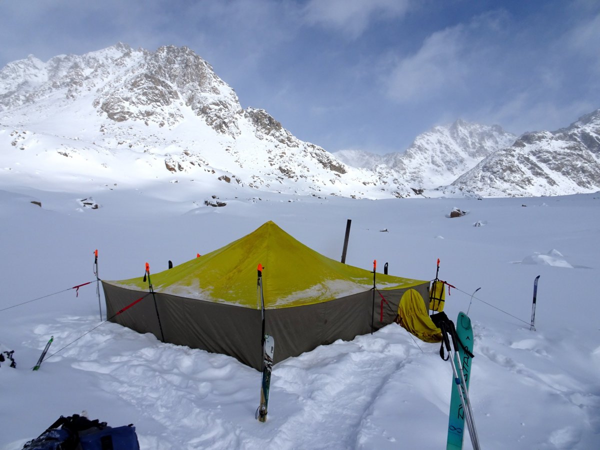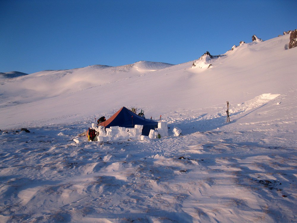 Двухслойная туристическая палатка-шатер Тикси-12 для лыжных зимних походов. Конструкция палатки позволяет установить в ней туристическую печь, а наличие двух слоев обеспечивает оптимальную температуру при минимальном количестве дров.