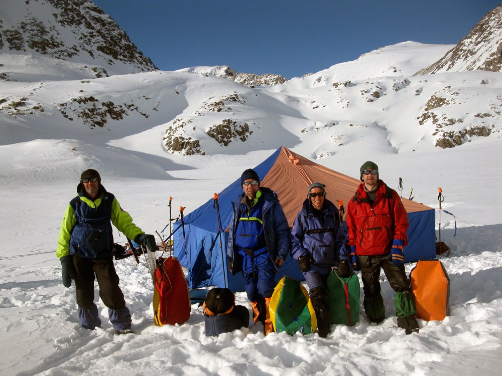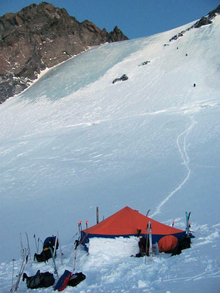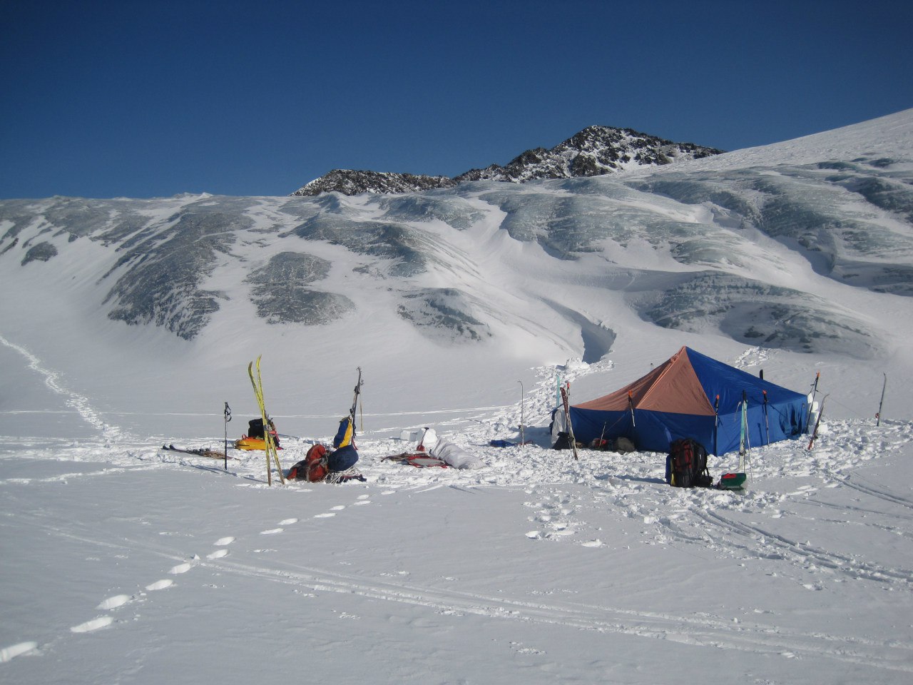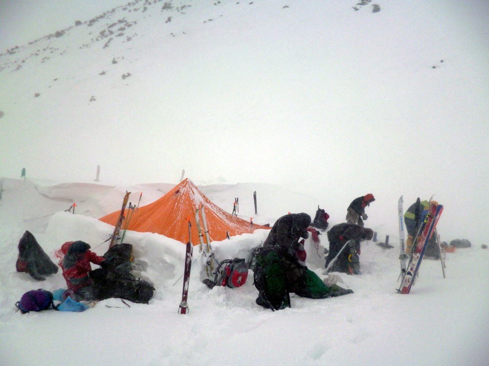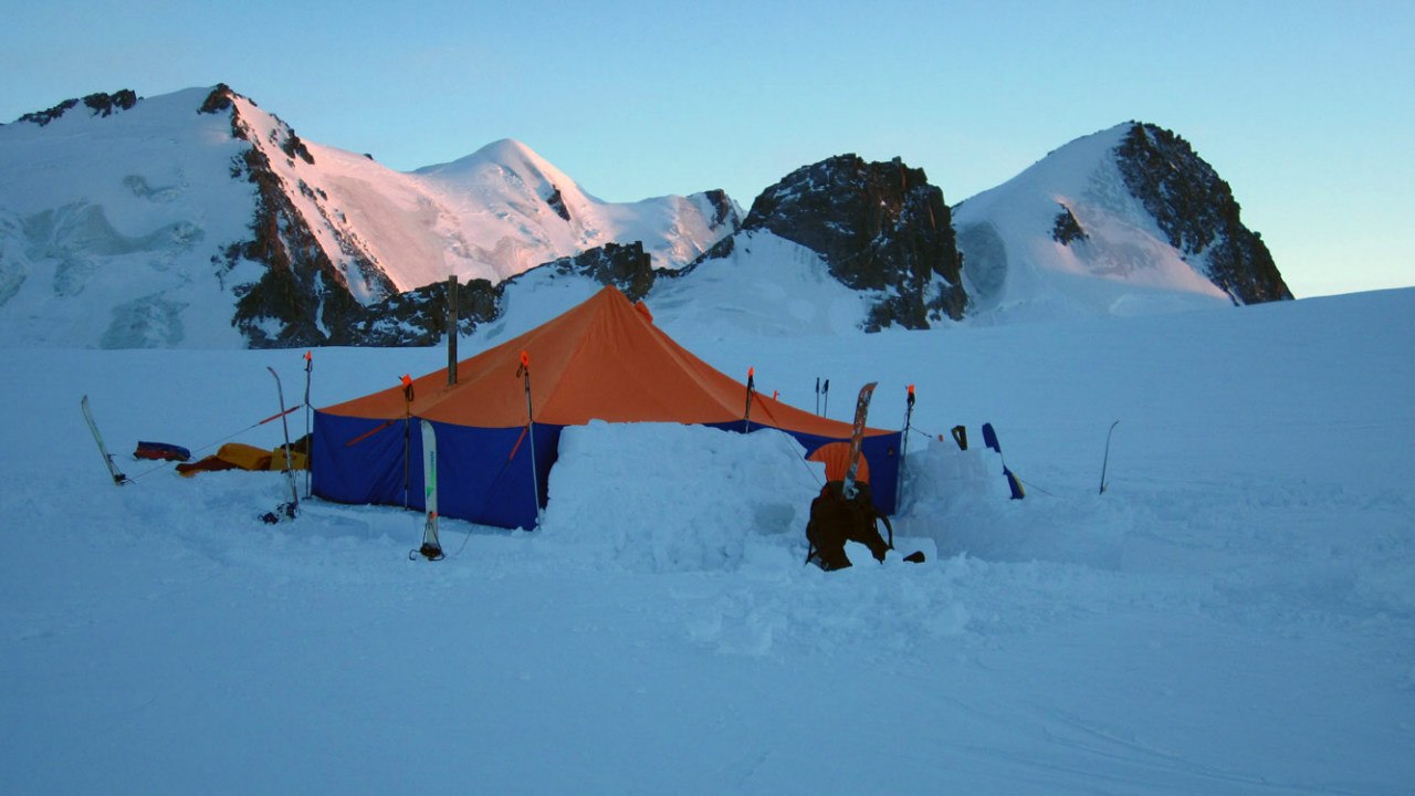 Двухслойная туристическая палатка-шатер Тикси-12 для лыжных зимних походов. Конструкция палатки позволяет установить в ней туристическую печь, а наличие двух слоев обеспечивает оптимальную температуру при минимальном количестве дров.