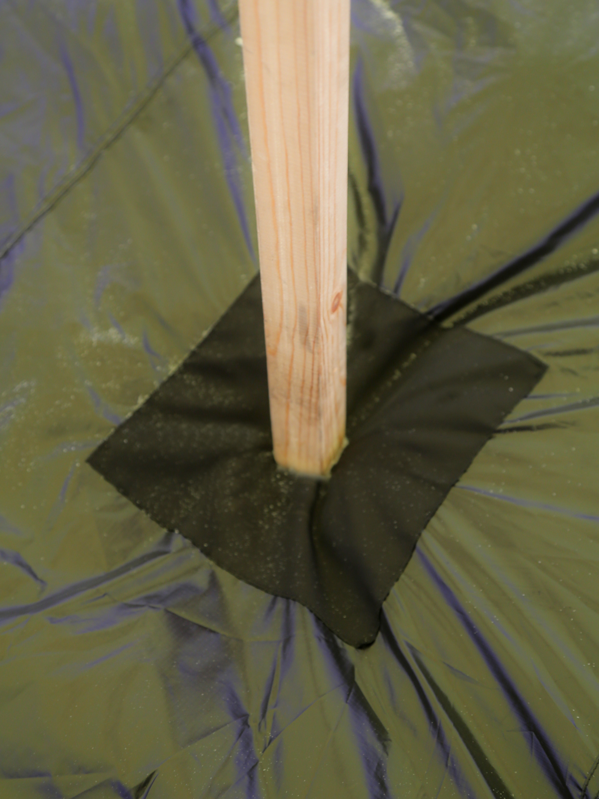 - Внутри палатки на дне сделано усиление из плотной ткани для упора центральной стойки. В верху, в центре купола, вшит "стакан" из плотной ткани для лучшего удержания купола палатки на центральной стойке
