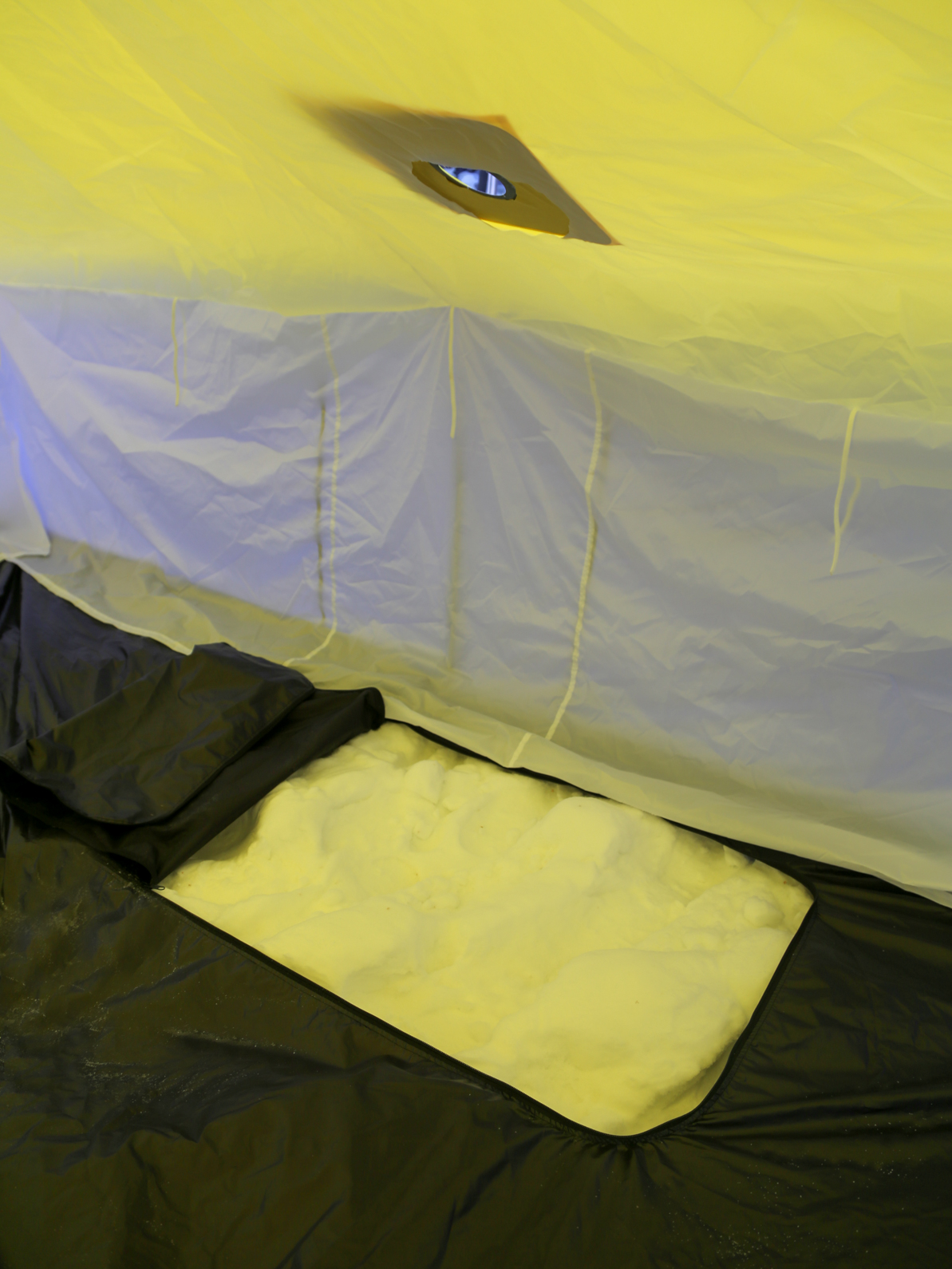 - Палатка хорошо выдерживает сильные ветровые нагрузки. При установке палатки на открытой местности, рекомендуется установить снежную стенку