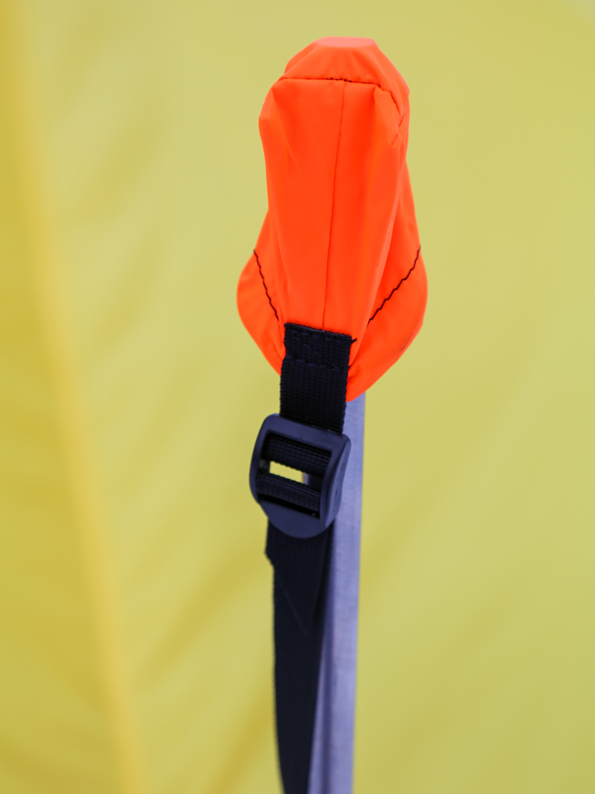 - В верхней части оттяжек расположен карман-уловитель для ручки лыжной палки. Карман-уловитель имеет стропу с пряжкой, которая позволяет использовать для растяжки бока палатки лыжные палки разной длины. Внизу палатки находятся петли для закрепления нижнего конца лыжной палки. Палатка устанавливается на 8 лыжных палок и центральную стойку длиной 2,0м (лыжные палки и стойка в комплект не входят)