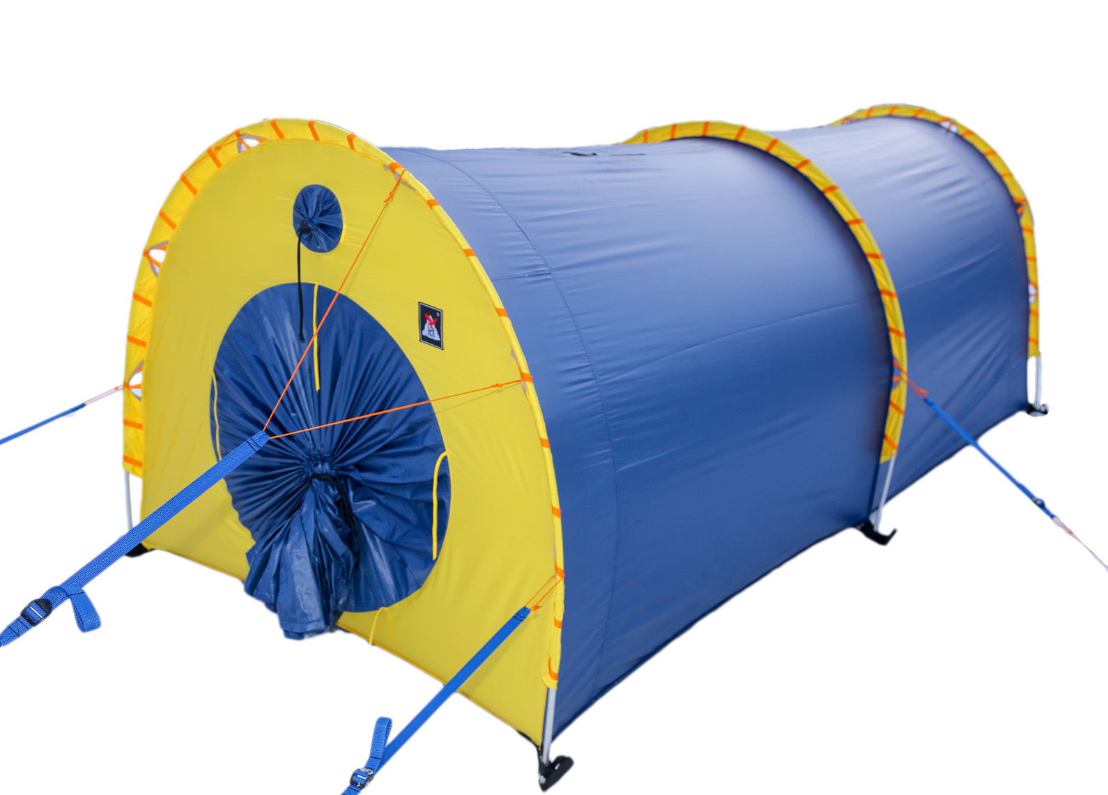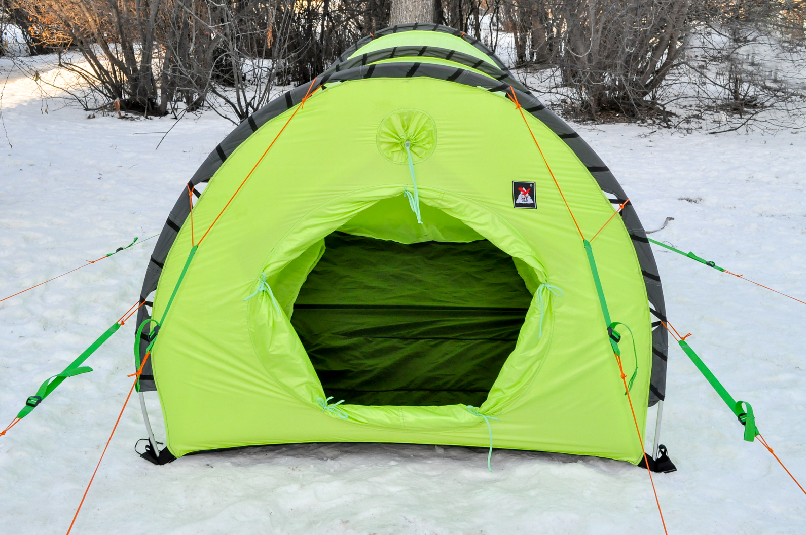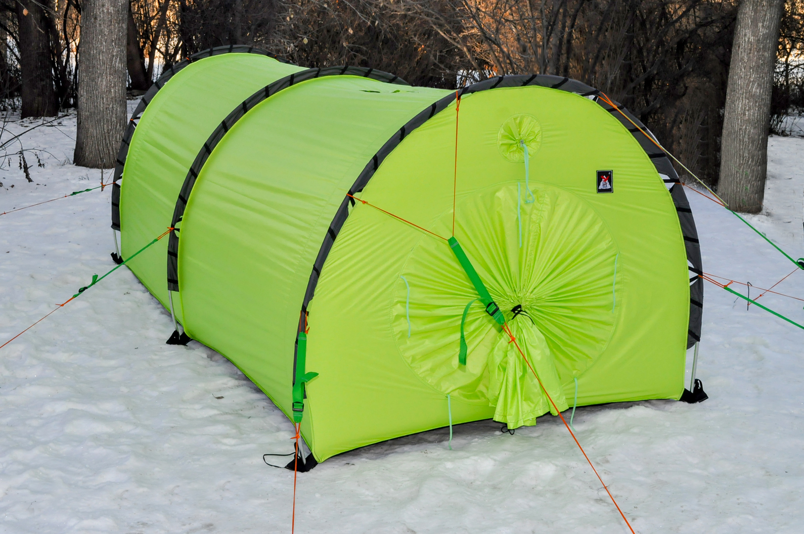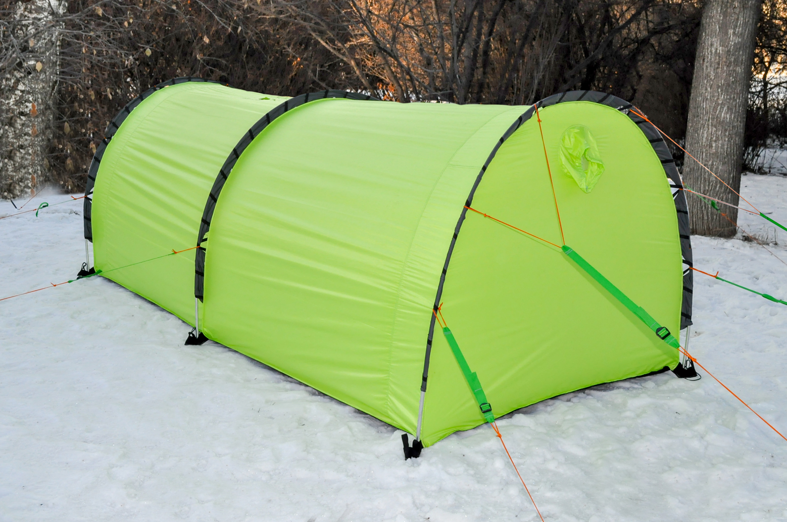 - В качестве дополнительного оборудования к палатке вы можете заказать ветроотбойный клин, который с помощью пряжек прикрепляется к торцу палатки. Его предназначение – уменьшить нагрузку на торец палатки при сильных ветрах, особенно в местах где нет возможности установить перед торцом палатки снежную стенку.