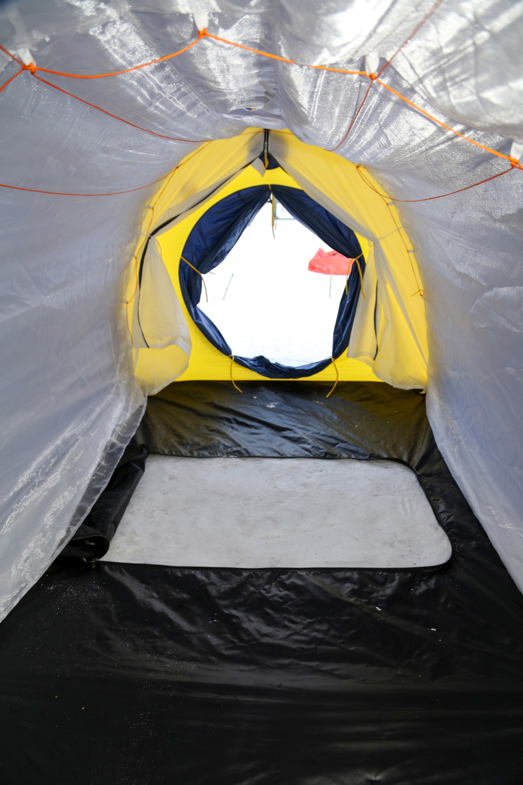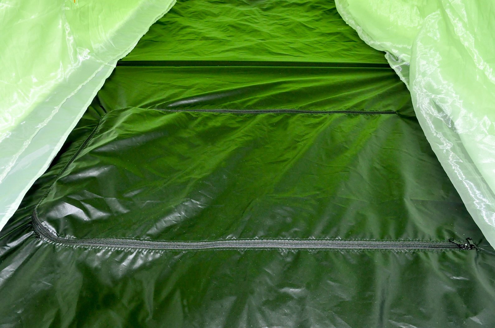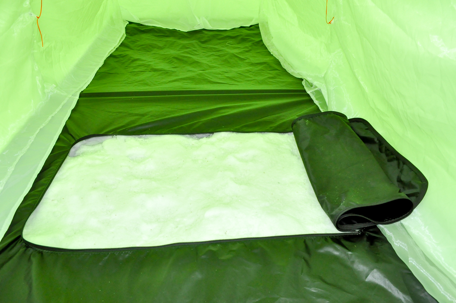 - В дне палатки расположен клапан на молнии – люк, позволяющий установить походную печку на землю или снег при необходимости и вымести из палатки мусор