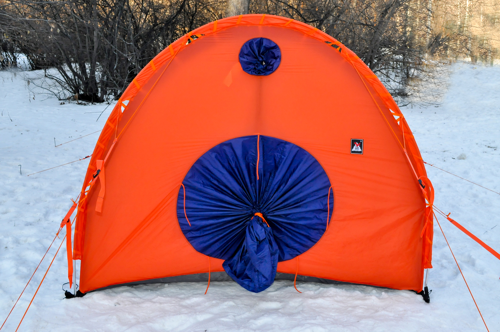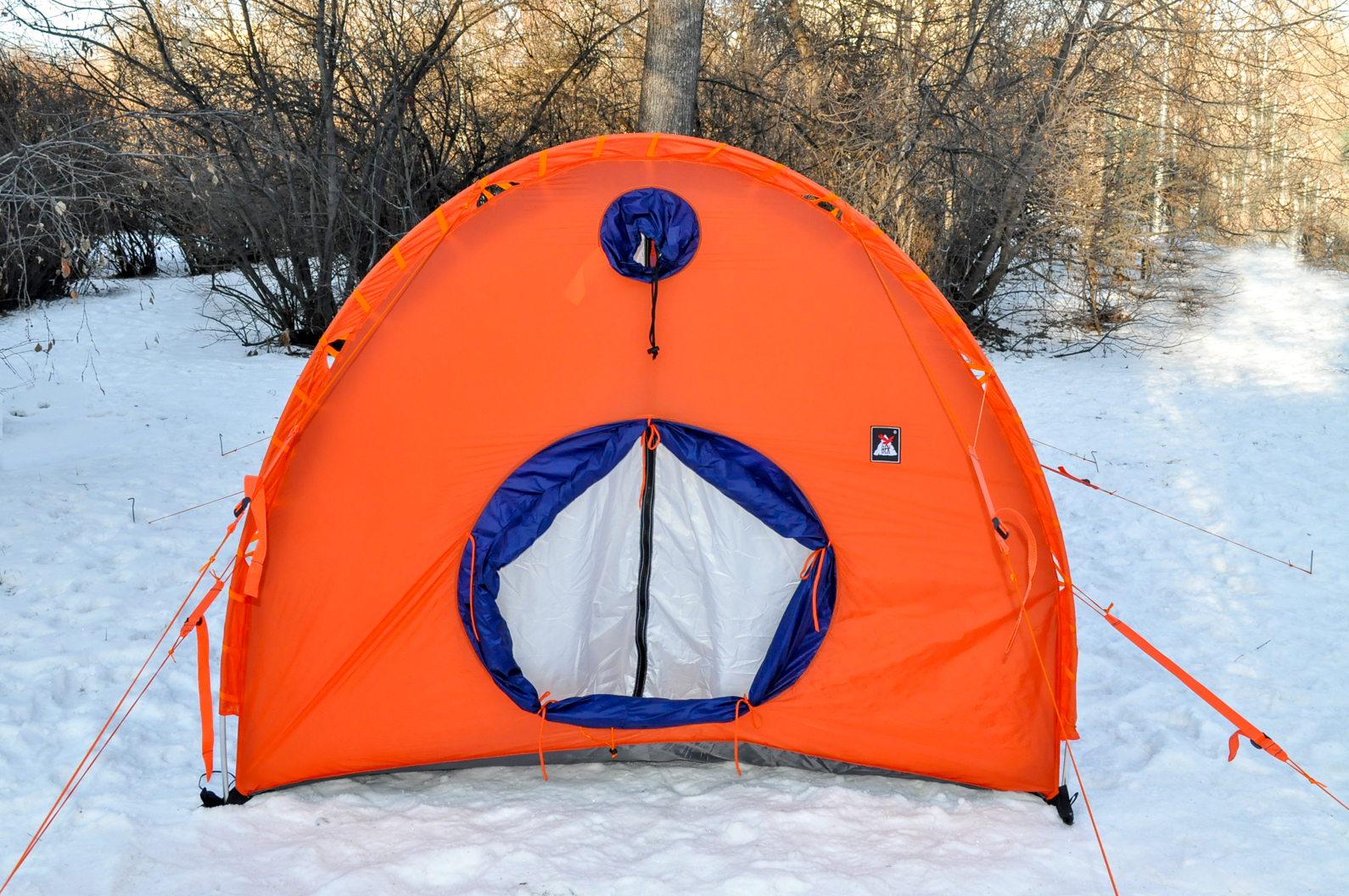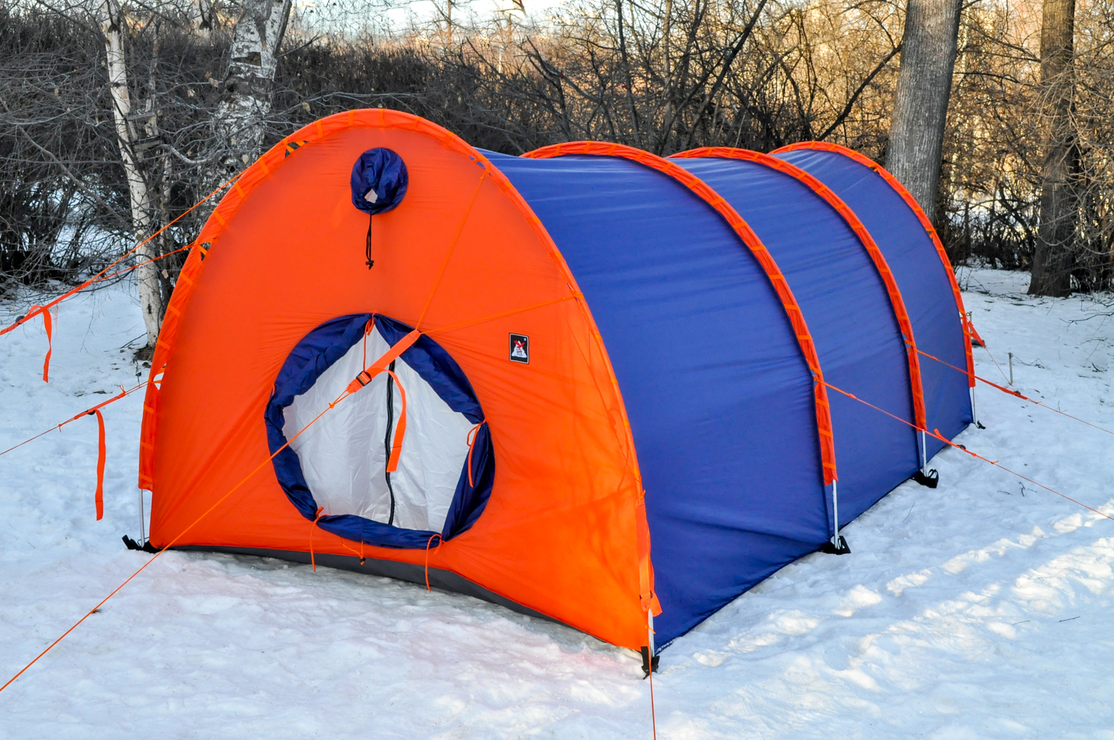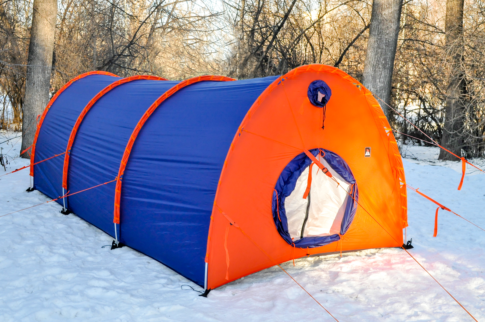 - Помимо 12 штатных оттяжек конструкция палатки позволяет установить дополнительные штормовые оттяжки в условиях сильных ветров. Это неоднократно использовалось в экспедициях по Заполярью и в Антарктиде