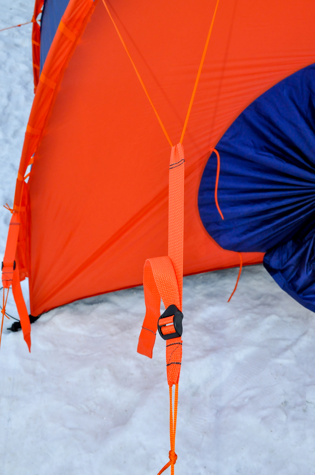 - Все три слоя соединены между собой стропами, которые обеспечивают воздушный зазор между ними. Конструкция соединения всех трех слоев стропами "армирует" её и увеличивает прочность палатки. Нагрузки первого слоя перераспределяются на второй и третий слой. Это позволяет эксплуатировать палатку в условиях сильных ветров, пурги, бурана