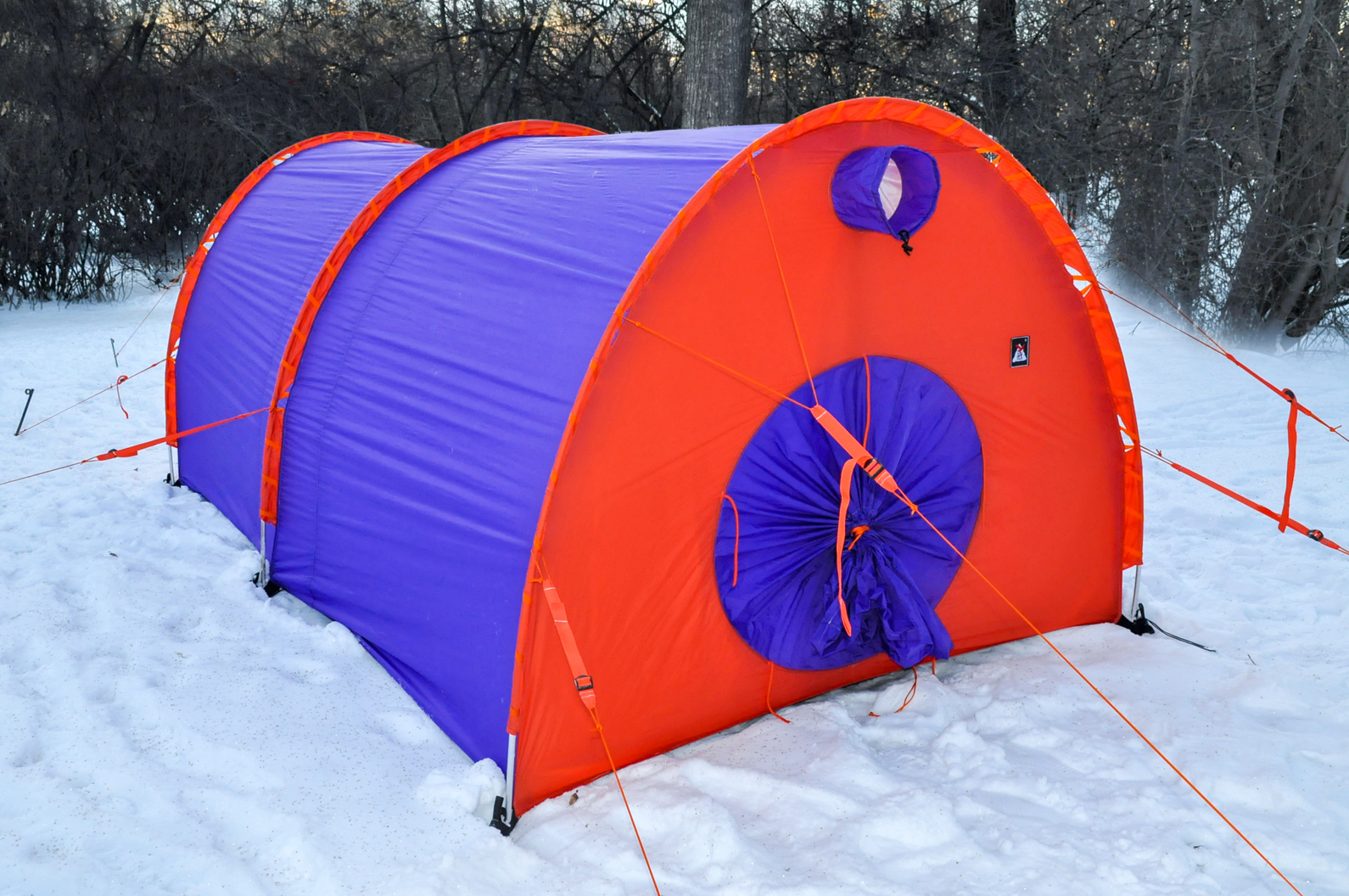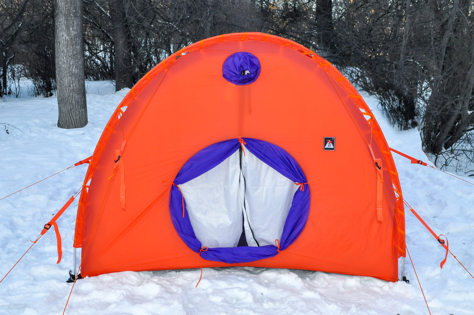 - В качестве дополнительного оборудования к палатке вы можете заказать ветроотбойный клин, который с помощью пряжек прикрепляется к торцу палатки. Его предназначение – уменьшить нагрузку на торец палатки при сильных ветрах, особенно в местах где нет возможности установить перед торцом палатки снежную стенку.