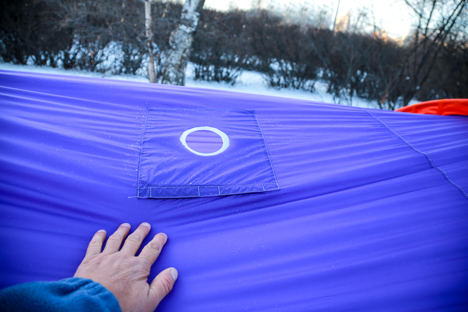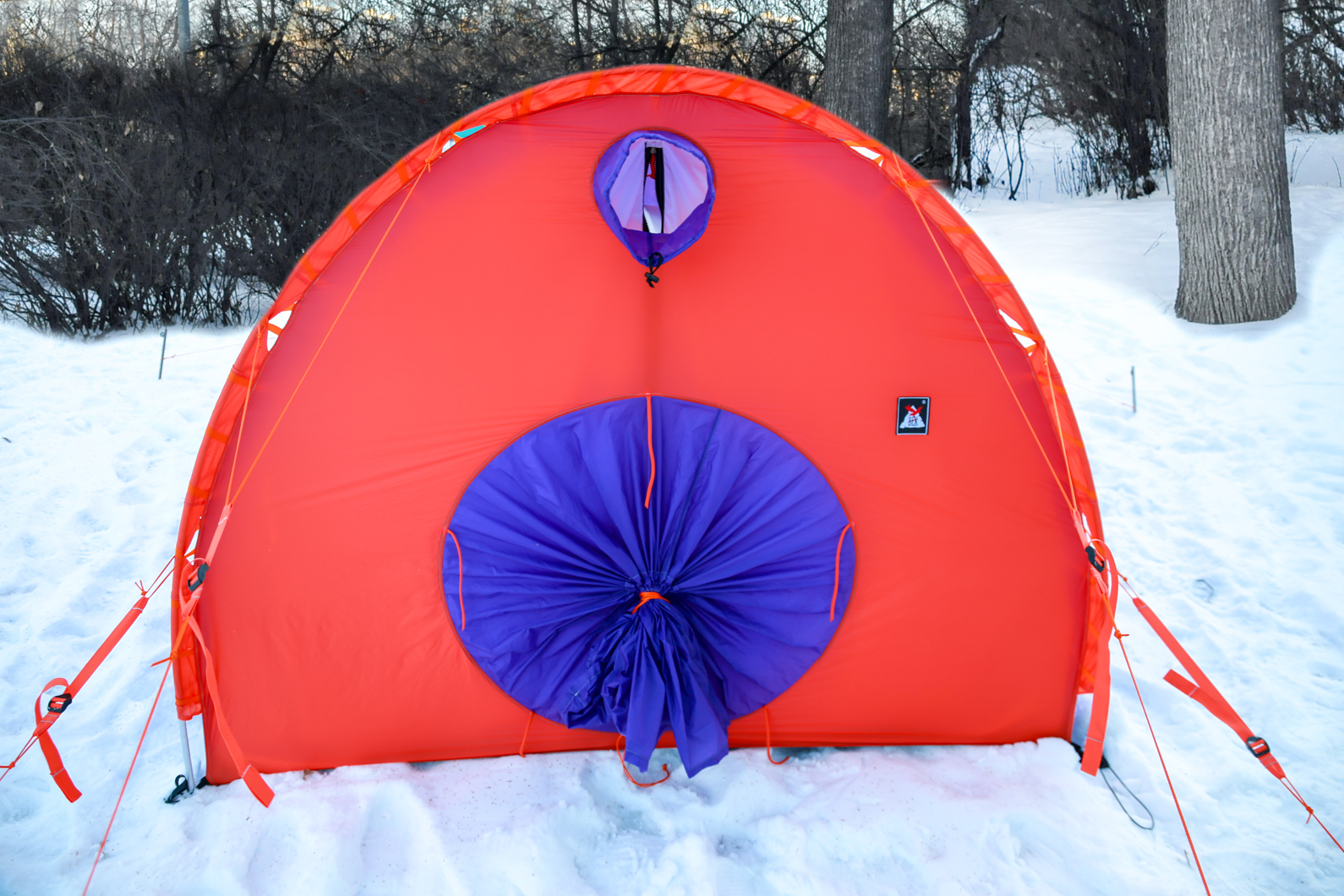 - В дне палатки расположен клапан на молнии – люк, позволяющий установить походную печку на землю или снег при необходимости и вымести из палатки мусор