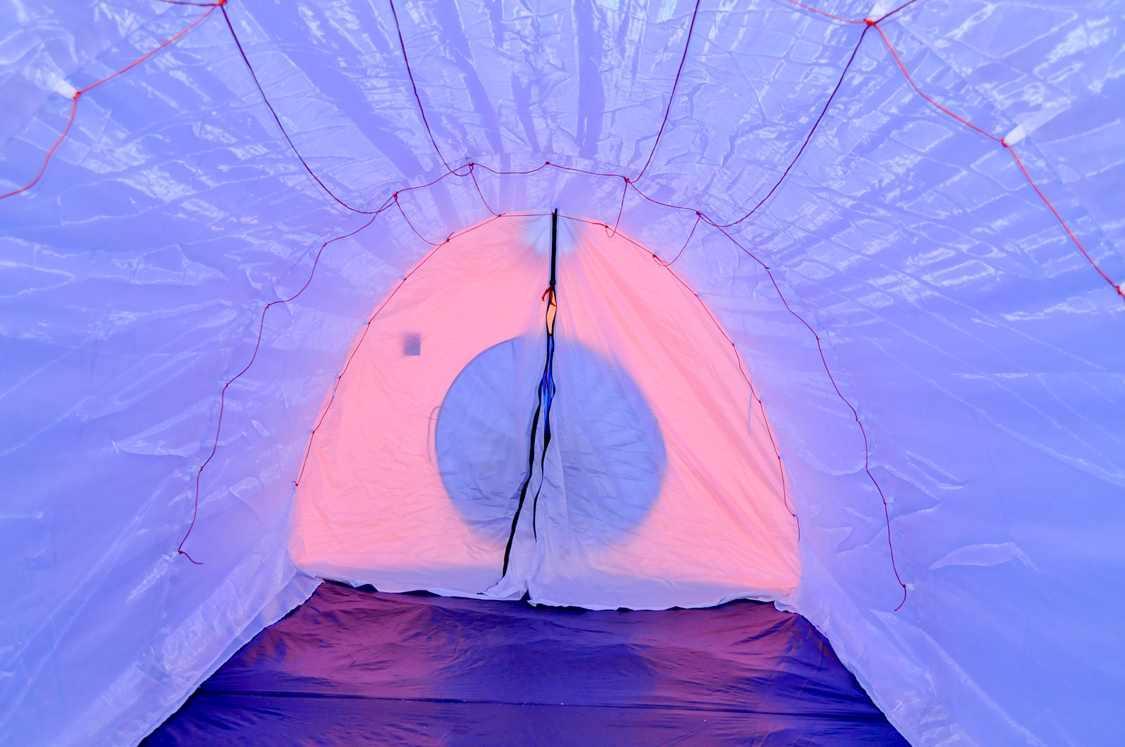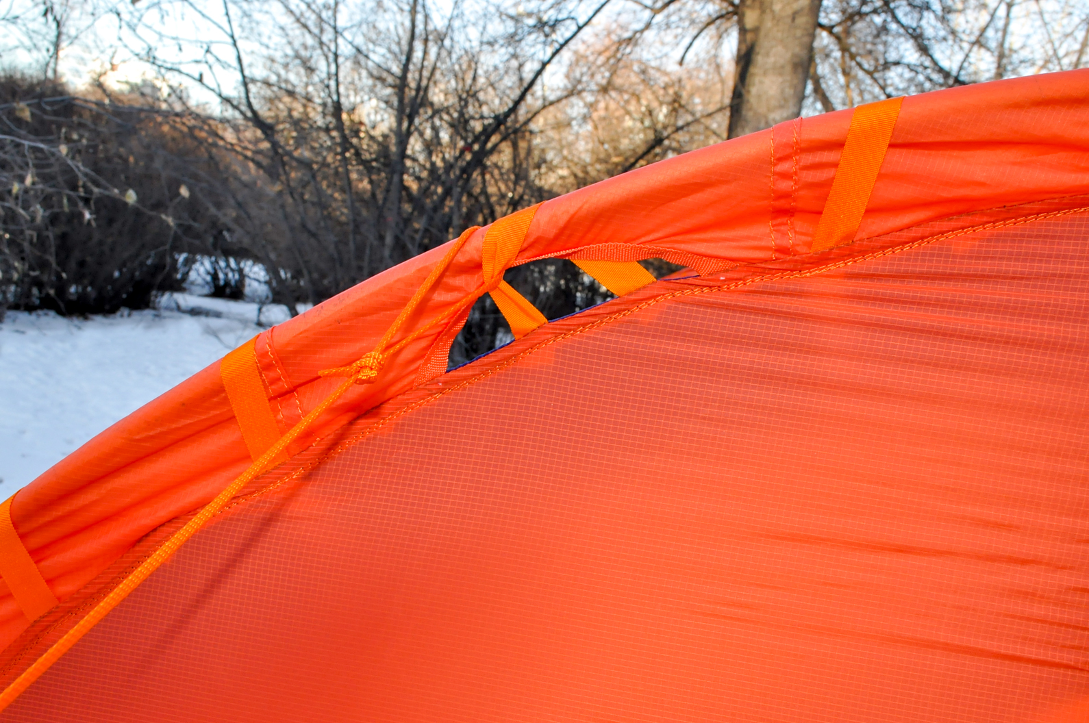 - Третий слой, тонкий "бантичный" капрон. Он препятствует попаданию измороси на одежду и спальники. Она образуется между вторым и третьим слоем в палатке