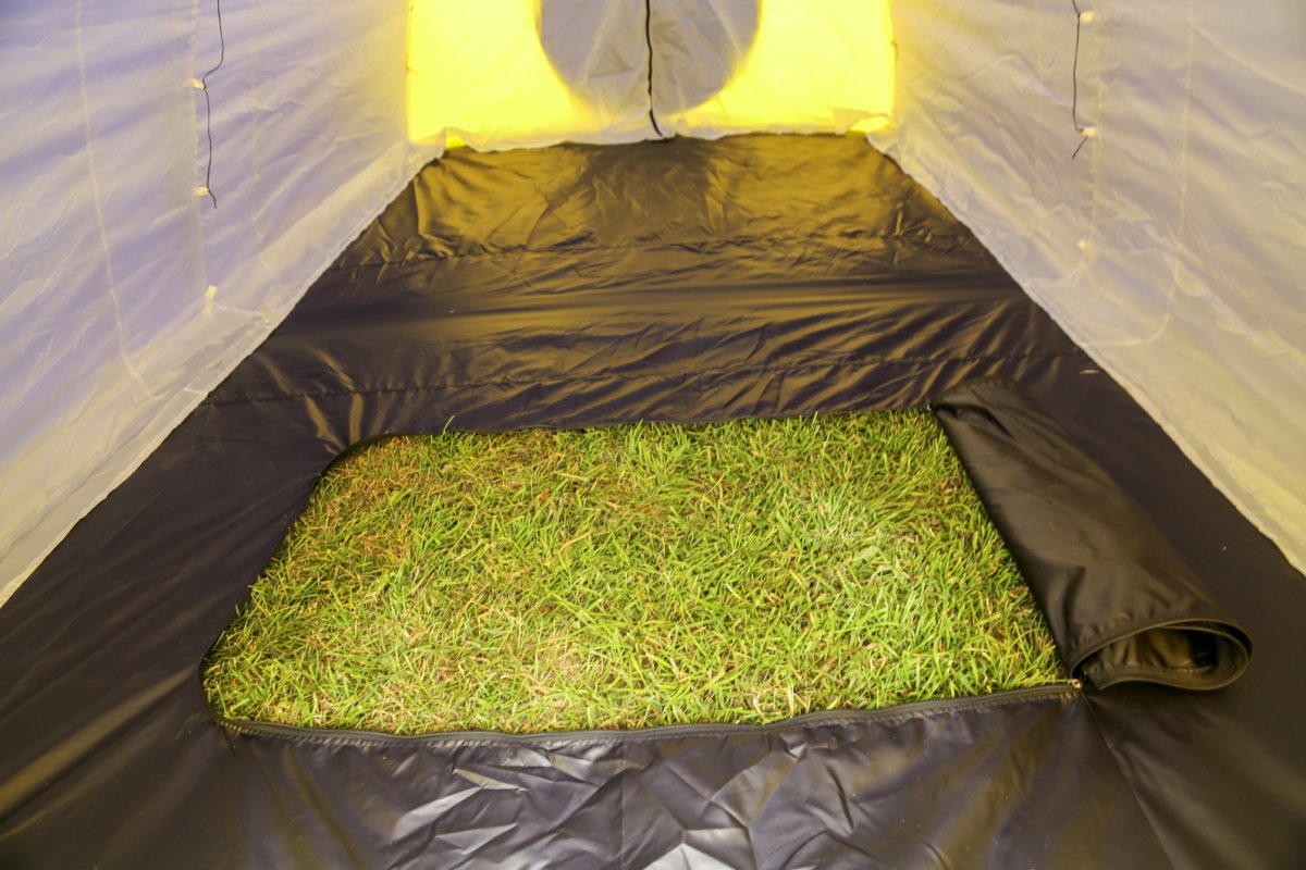 - В дне палатки расположен клапан на молнии – люк, позволяющий установить походную печку на землю или снег при необходимости и вымести из палатки мусор