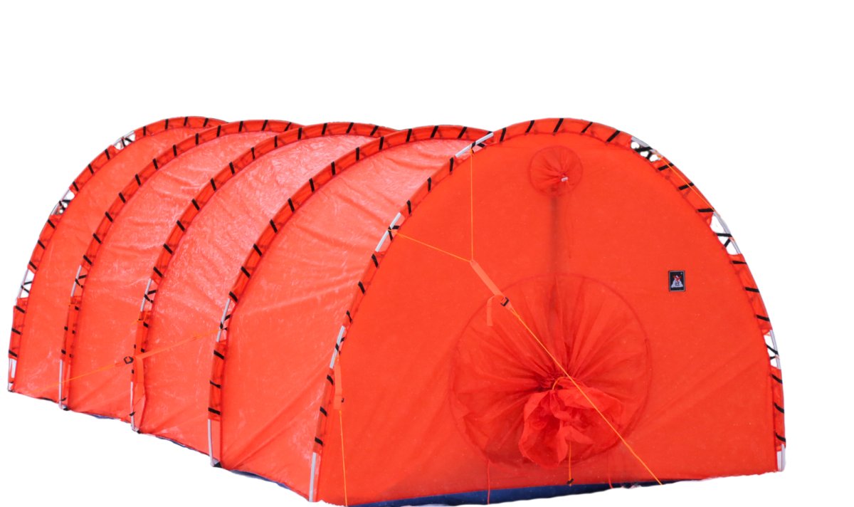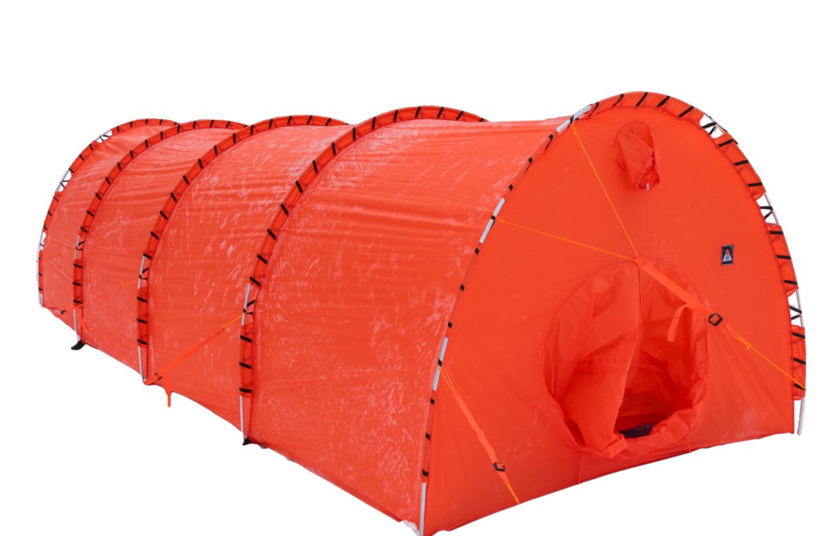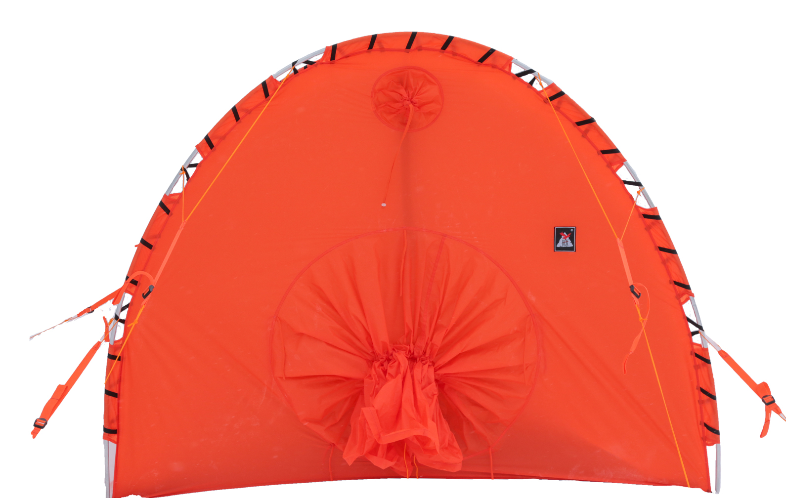 - В качестве дополнительного оборудования к палатке вы можете заказать ветроотбойный клин, который с помощью пряжек прикрепляется к торцу палатки. Его предназначение – уменьшить нагрузку на торец палатки при сильных ветрах, особенно в местах где нет возможности установить перед торцом палатки снежную стенку.