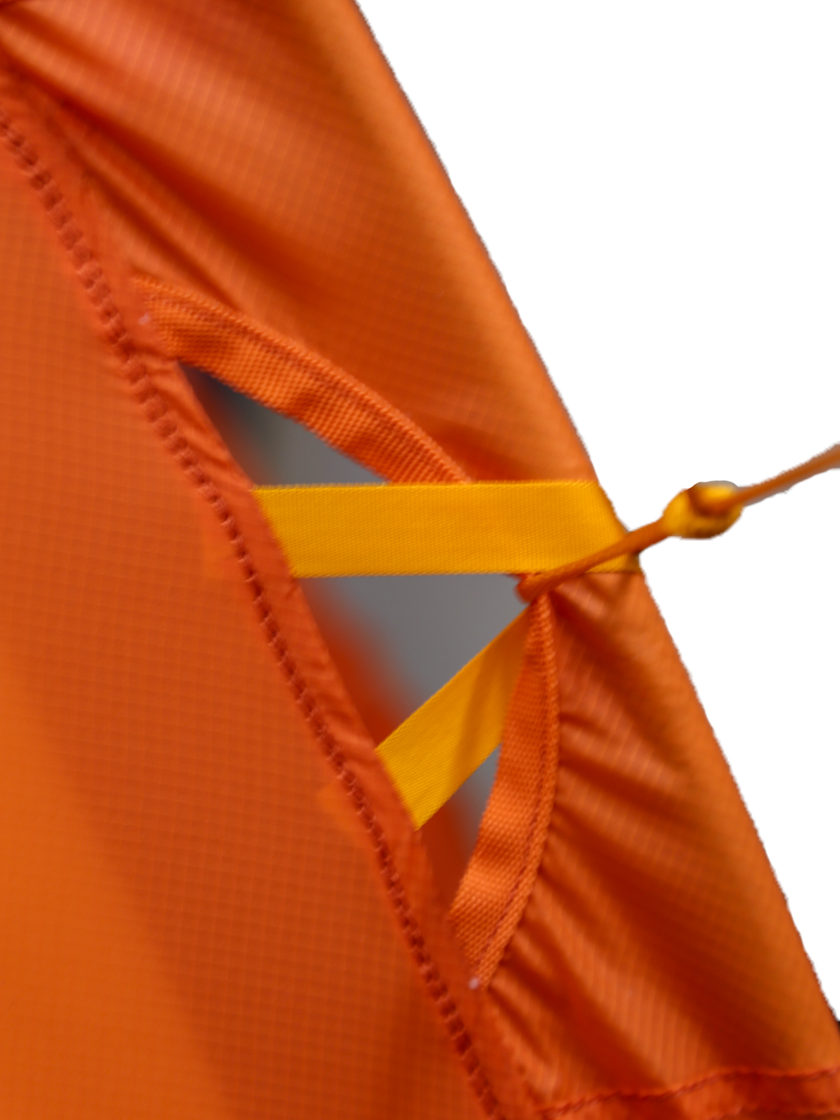 - Все три слоя соединены между собой стропами, которые обеспечивают воздушный зазор между ними. Конструкция соединения всех трех слоев стропами "армирует" её и увеличивает прочность палатки. Нагрузки первого слоя перераспределяются на второй и третий слой. Это позволяет эксплуатировать палатку в условиях сильных ветров, пурги, бурана