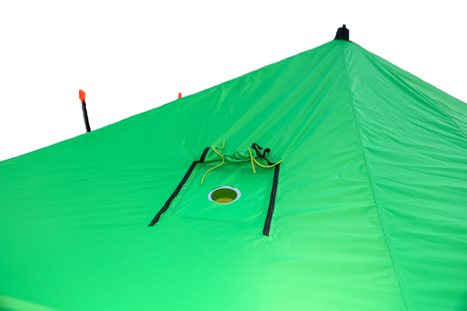 - Тент имеет металлическую разделку, которая защищает его от жара печной трубы. При необходимости отверстие для печной трубы в тенте закрывается клапаном