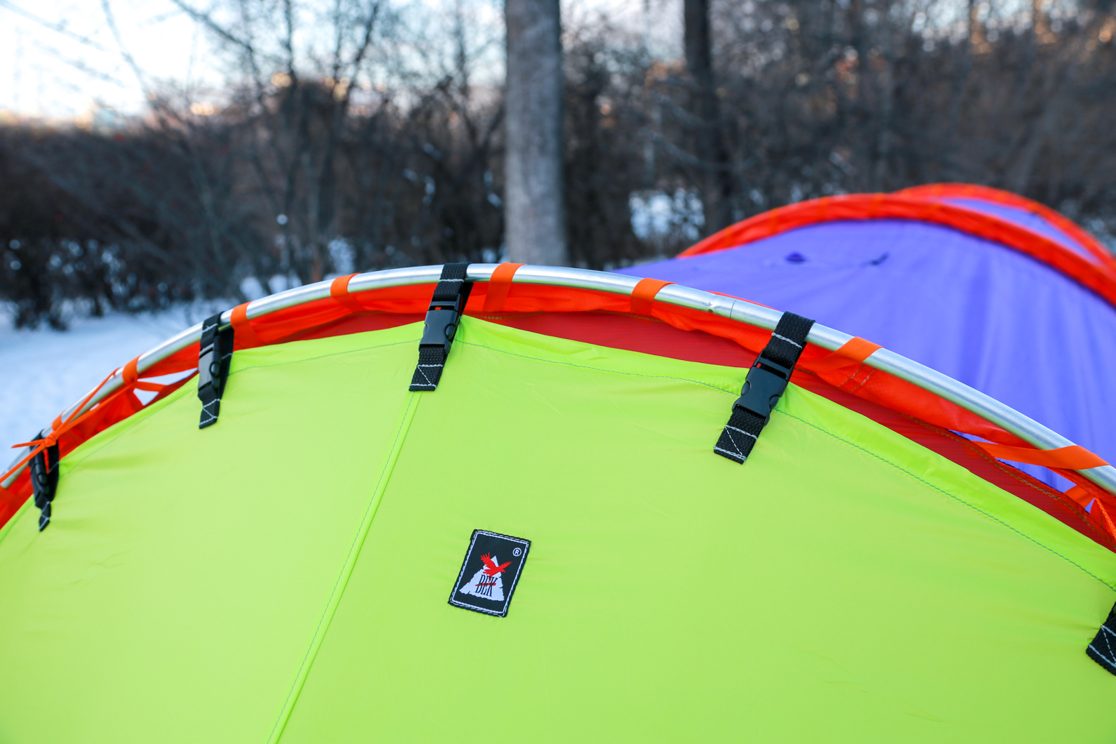 - Ветрозащитный клин с помощью строп с пряжками прикрепляется к дуге палатки. Для того чтобы пристегнуть клин, при установке палатки на каркас, не надо использовать наружные карманы для дуг. На алюминиевую дугу надеваем-накидываем только стропы для дуг в обход наружных карманов для дуг, после чего пристегиваем ветрозащитный клин