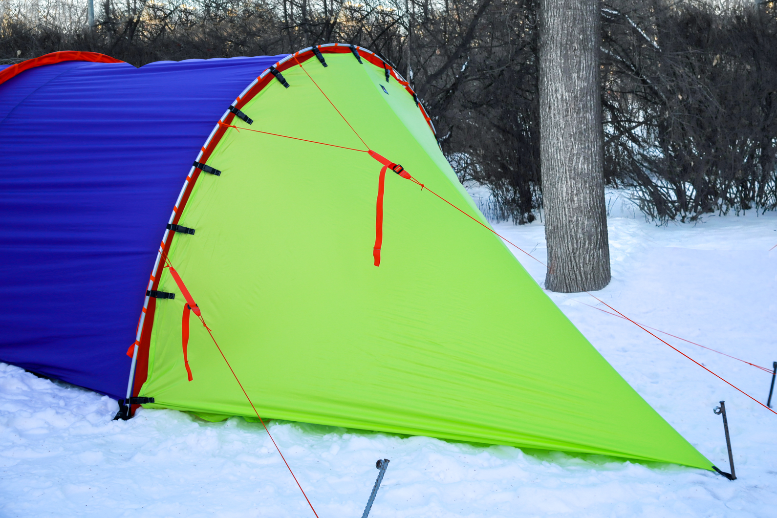 - Клин пристегивается к одному из торцов палатки, обращенному к ветру, что позволяет снять с торца палатки ветровую нагрузку