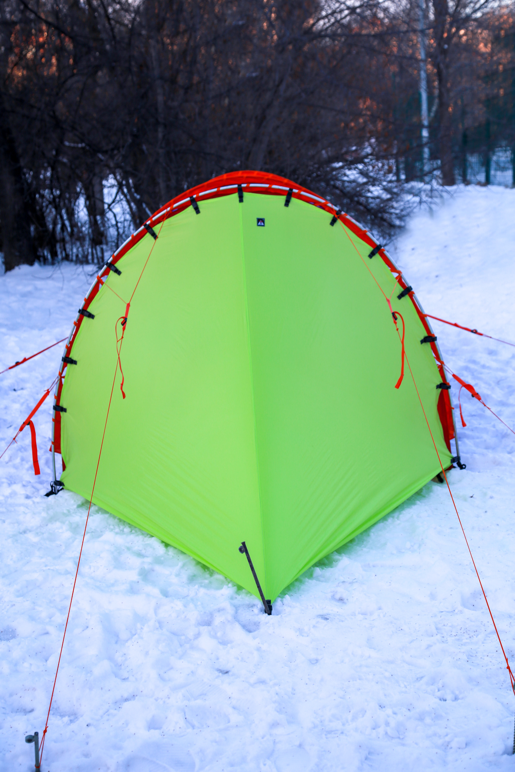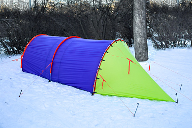 - Клин пристегивается к одному из торцов палатки, обращенному к ветру, что позволяет снять с торца палатки ветровую нагрузку