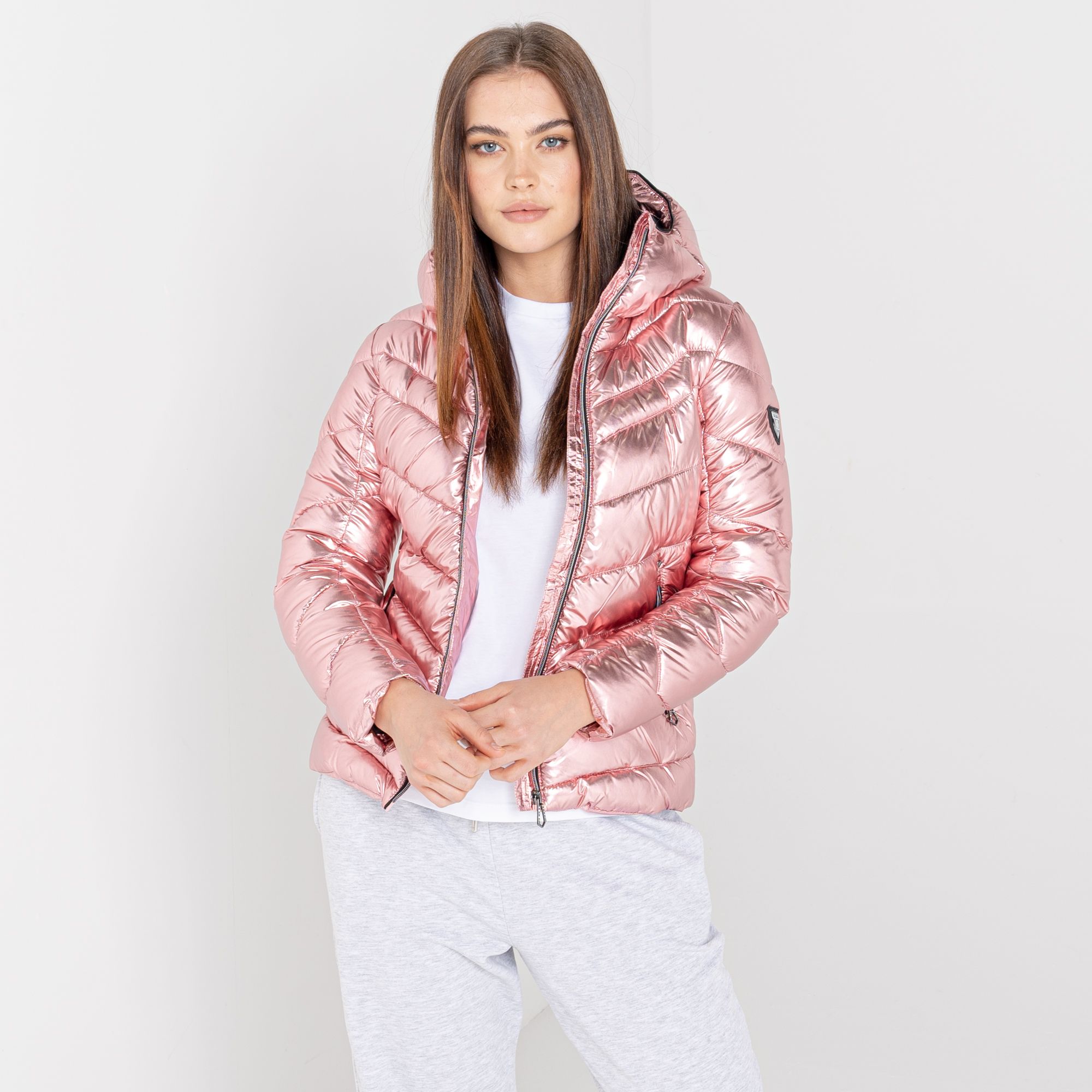 Стильная теплая мягкая куртка из блестящего полиэфирного материала. Украшена кристаллами Swarovski®. Оснащена плотным капюшоном с высоким воротником и защитой подбородка.