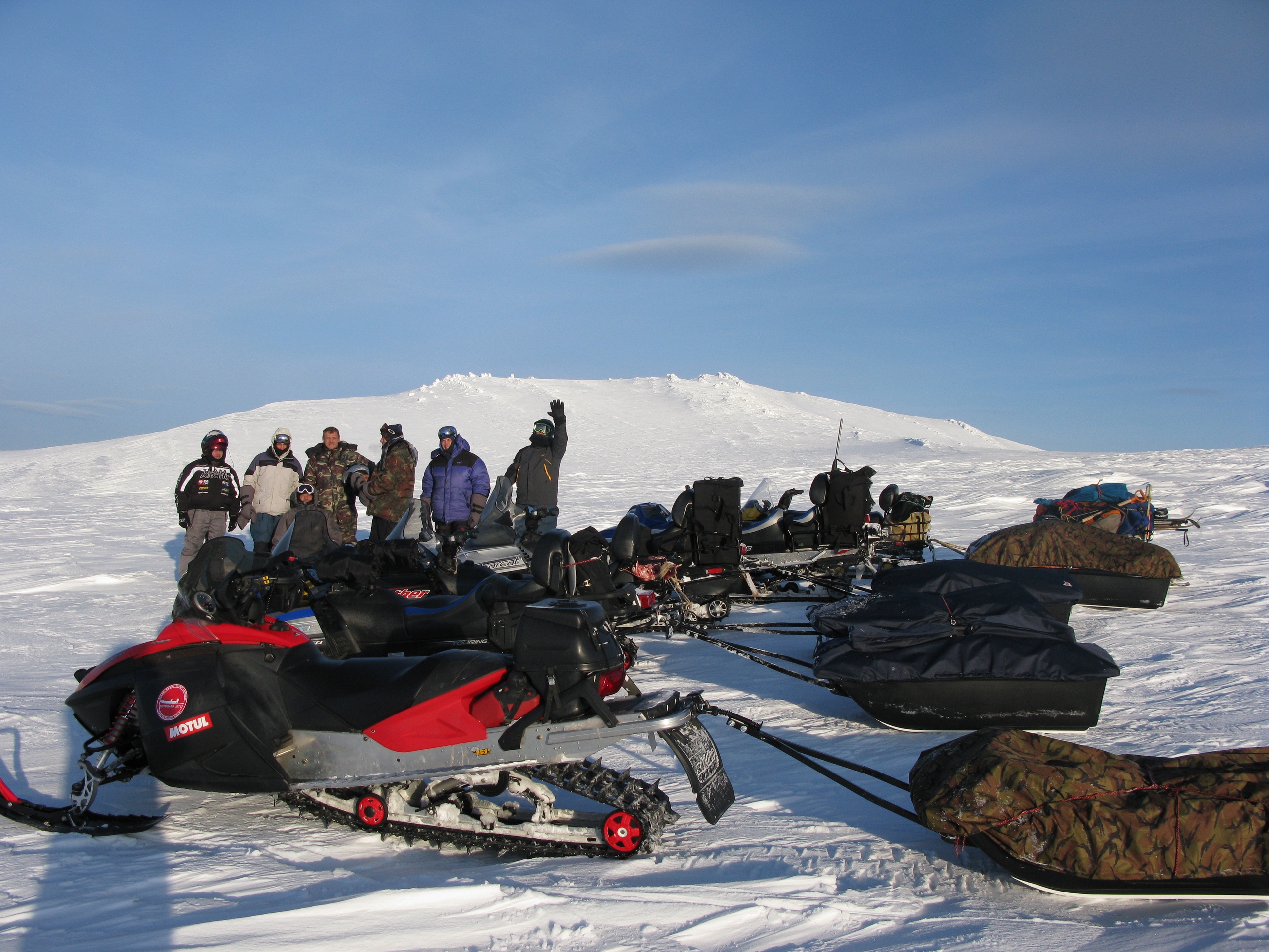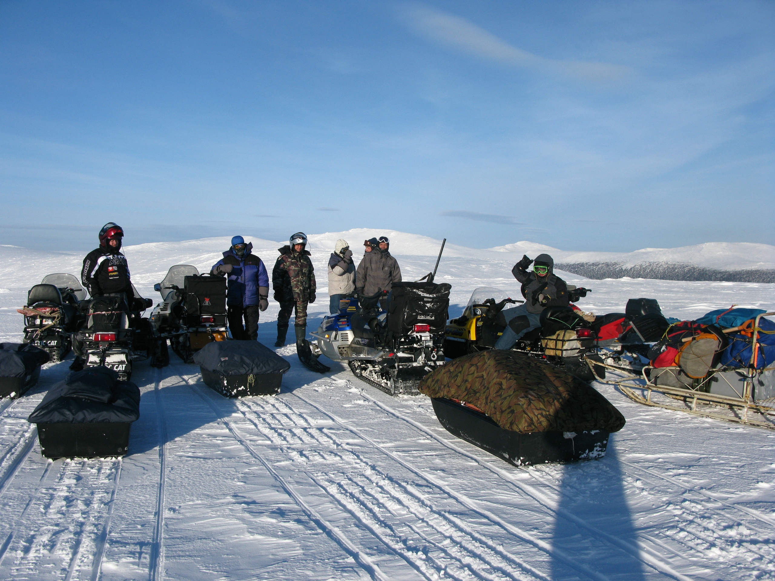 Кроме снегохода Ski-doo 550, который от границы леса спокойно заехал с санями на хребет с плотно укатанным ветрами настом, ни одному из других снегоходов не удалось продолжить подъем. Они зарывались в снег и останавливались. В итоге все сани затаскивал наверх один трудяга. Далее впереди уже проглядывался Главный Уральский Хребет и вершина Холатчахль, что в переводе с мансийского обозначает "Гора мертвецов", под которой на камне-останце прикреплена мемориальная доска в честь погибших туристов.