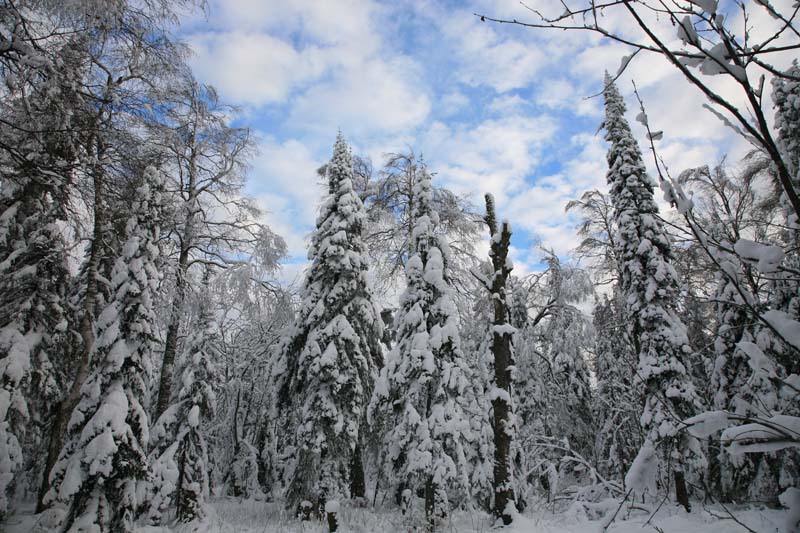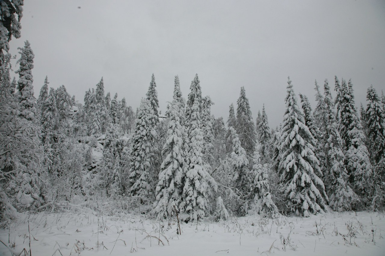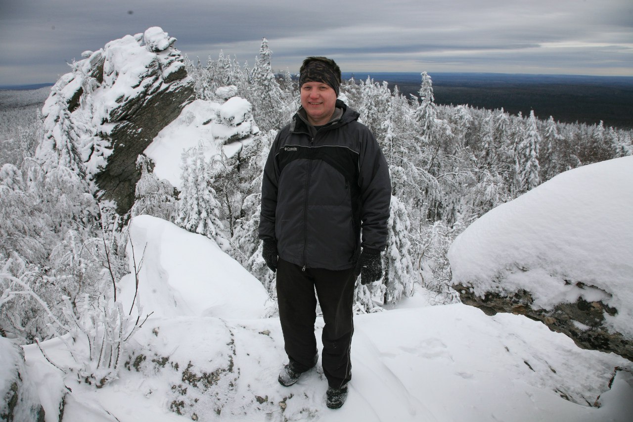 Снег появился на середине пути, а глубина его на горе достигала 20-25 сантиметров. Сверху открылся неповторимый пейзаж: заснеженные ели, березы, засыпанные снегом, белые от инея скалы.